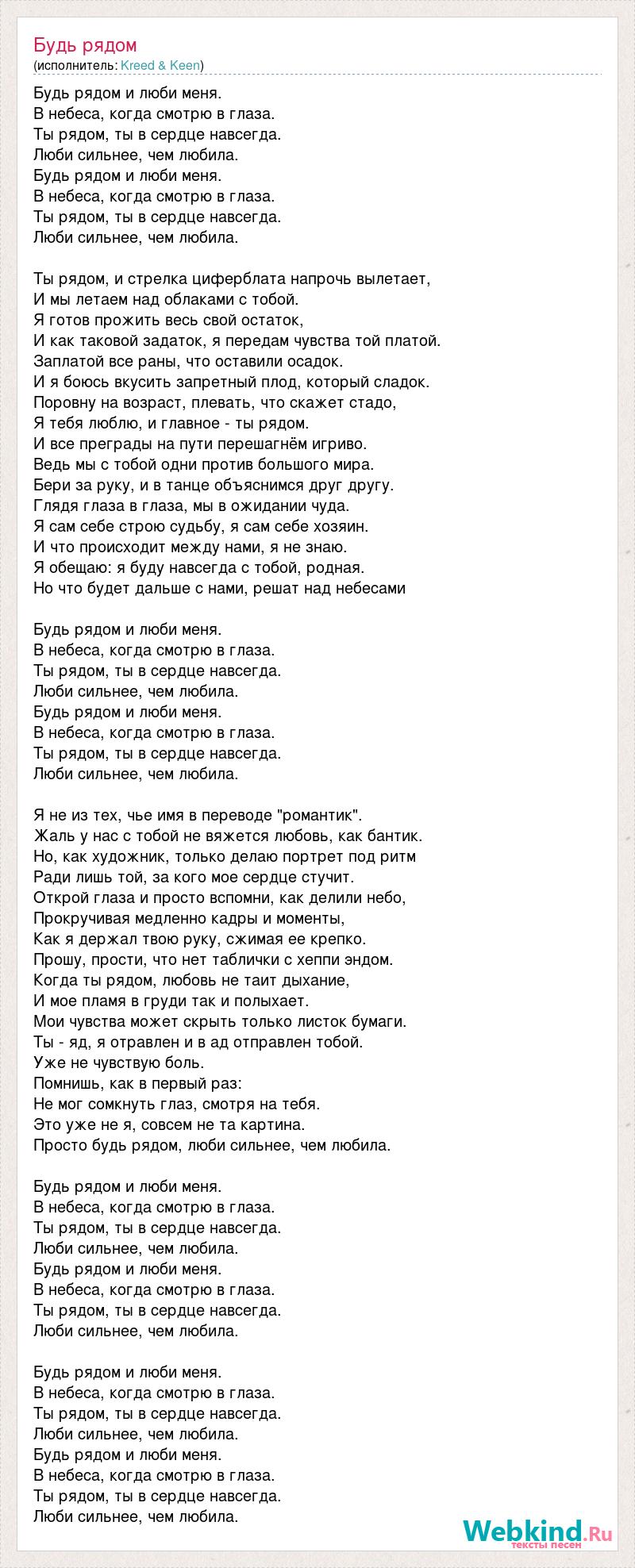 Будь рядом и люби меня. В небеса, когда смотрю в глаза. Ты рядом, ты в сердце навсегда. Люби сильнее, чем любила. Будь рядом и люби меня. В небеса, когда смотрю в глаза. Ты рядом, ты в сердце навсегда. Люби сильнее, чем любила. Ты рядом, и стрелка циферблата напрочь вылетает, И мы летаем над облаками с тобой. Я готов прожить весь свой остаток, И как таковой задаток, я передам чувства той платой. Заплатой все раны, что оставили осадок. И я боюсь вкусить запретный плод, который сладок. Поровну на возраст, плевать, что скажет стадо, Я тебя люблю, и главное - ты рядом. И все преграды на пути перешагнём игриво. Ведь мы с тобой одни против большого мира. Бери за руку, и в танце объяснимся друг другу. Глядя глаза в глаза, мы в ожидании чуда. Я сам себе строю судьбу, я сам себе хозяин. И что происходит между нами, я не знаю. Я обещаю: я буду навсегда с тобой, родная. Но что будет дальше с нами, решат над небесами Будь рядом и люби меня. В небеса, когда смотрю в глаза. Ты рядом, ты в сердце навсегда. Люби сильнее, чем любила. Будь рядом и люби меня. В небеса, когда смотрю в глаза. Ты рядом, ты в сердце навсегда. Люби сильнее, чем любила. Я не из тех, чье имя в переводе "романтик". Жаль у нас с тобой не вяжется любовь, как бантик. Но, как художник, только делаю портрет под ритм Ради лишь той, за кого мое сердце стучит. Открой глаза и просто вспомни, как делили небо, Прокручивая медленно кадры и моменты, Как я держал твою руку, сжимая ее крепко. Прошу, прости, что нет таблички с хеппи эндом. Когда ты рядом, любовь не таит дыхание, И мое пламя в груди так и полыхает. Мои чувства может скрыть только листок бумаги. Ты - яд, я отравлен и в ад отправлен тобой. Уже не чувствую боль. Помнишь, как в первый раз: Не мог сомкнуть глаз, смотря на тебя. Это уже не я, совсем не та картина. Просто будь рядом, люби сильнее, чем любила. Будь рядом и люби меня. В небеса, когда смотрю в глаза. Ты рядом, ты в сердце навсегда. Люби сильнее, чем любила. Будь рядом и люби меня. В небеса, когда смотрю в глаза. Ты рядом, ты в сердце навсегда. Люби сильнее, чем любила. Будь рядом и люби меня. В небеса, когда смотрю в глаза. Ты рядом, ты в сердце навсегда. Люби сильнее, чем любила. Будь рядом и люби меня. В небеса, когда смотрю в глаза. Ты рядом, ты в сердце навсегда. Люби сильнее, чем любила.