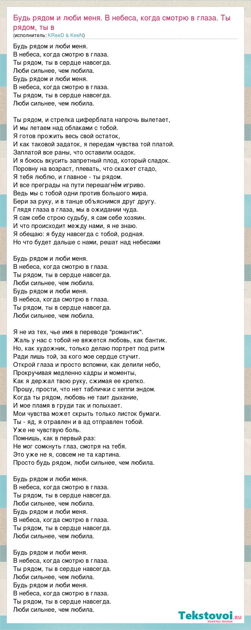 Будь рядом и люби меня. В небеса, когда смотрю в глаза. Ты рядом, ты в сердце навсегда. Люби сильнее, чем любила. Будь рядом и люби меня. В небеса, когда смотрю в глаза. Ты рядом, ты в сердце навсегда. Люби сильнее, чем любила. Ты рядом, и стрелка циферблата напрочь вылетает, И мы летаем над облаками с тобой. Я готов прожить весь свой остаток, И как таковой задаток, я передам чувства той платой. Заплатой все раны, что оставили осадок. И я боюсь вкусить запретный плод, который сладок. Поровну на возраст, плевать, что скажет стадо, Я тебя люблю, и главное - ты рядом. И все преграды на пути перешагнём игриво. Ведь мы с тобой одни против большого мира. Бери за руку, и в танце объяснимся друг другу. Глядя глаза в глаза, мы в ожидании чуда. Я сам себе строю судьбу, я сам себе хозяин. И что происходит между нами, я не знаю. Я обещаю: я буду навсегда с тобой, родная. Но что будет дальше с нами, решат над небесами Будь рядом и люби меня. В небеса, когда смотрю в глаза. Ты рядом, ты в сердце навсегда. Люби сильнее, чем любила. Будь рядом и люби меня. В небеса, когда смотрю в глаза. Ты рядом, ты в сердце навсегда. Люби сильнее, чем любила. Я не из тех, чье имя в переводе "романтик". Жаль у нас с тобой не вяжется любовь, как бантик. Но, как художник, только делаю портрет под ритм Ради лишь той, за кого мое сердце стучит. Открой глаза и просто вспомни, как делили небо, Прокручивая медленно кадры и моменты, Как я держал твою руку, сжимая ее крепко. Прошу, прости, что нет таблички с хеппи эндом. Когда ты рядом, любовь не таит дыхание, И мое пламя в груди так и полыхает. Мои чувства может скрыть только листок бумаги. Ты - яд, я отравлен и в ад отправлен тобой. Уже не чувствую боль. Помнишь, как в первый раз: Не мог сомкнуть глаз, смотря на тебя. Это уже не я, совсем не та картина. Просто будь рядом, люби сильнее, чем любила. Будь рядом и люби меня. В небеса, когда смотрю в глаза. Ты рядом, ты в сердце навсегда. Люби сильнее, чем любила. Будь рядом и люби меня. В небеса, когда смотрю в глаза. Ты рядом, ты в сердце навсегда. Люби сильнее, чем любила. Будь рядом и люби меня. В небеса, когда смотрю в глаза. Ты рядом, ты в сердце навсегда. Люби сильнее, чем любила. Будь рядом и люби меня. В небеса, когда смотрю в глаза. Ты рядом, ты в сердце навсегда. Люби сильнее, чем любила.