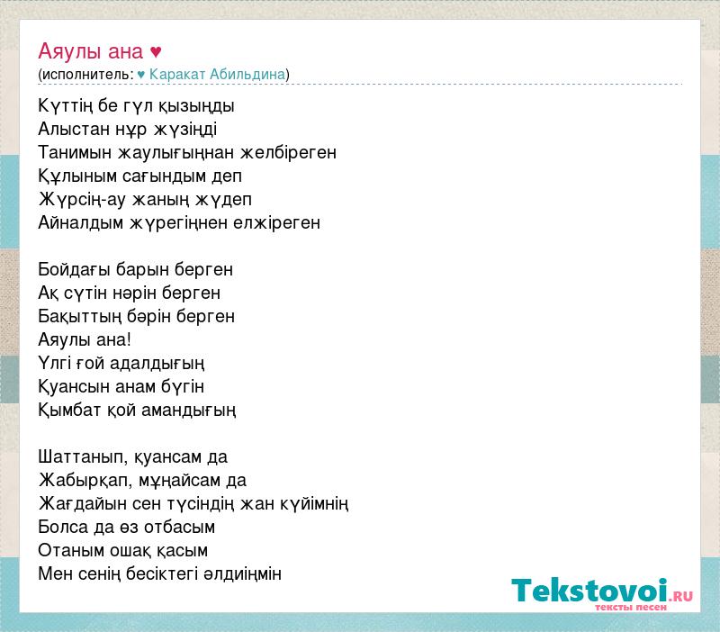Күттің бе гүл қызыңды Алыстан нұр жүзіңді Танимын жаулығыңнан желбіреген Құлыным сағындым деп Жүрсің-ау жаның жүдеп Айналдым жүрегіңнен елжіреген Бойдағы барын берген Ақ сүтін нәрін берген Бақыттың бәрін берген Аяулы ана! Үлгі ғой адалдығың Қуансын анам бүгін Қымбат қой амандығың Шаттанып, қуансам да Жабырқап, мұңайсам да Жағдайын сен түсіндің жан күйімнің Болса да өз отбасым Отаным ошақ қасым Мен сенің бесіктегі әлдиіңмін