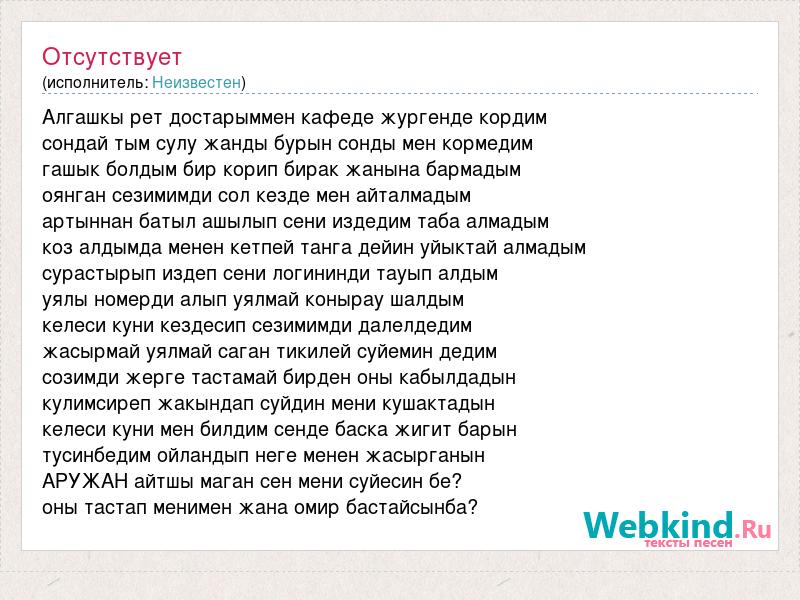 Алгашкы рет достарыммен кафеде жургенде кордим сондай тым сулу жанды бурын сонды мен кормедим гашык болдым бир корип бирак жанына бармадым оянган сезимимди сол кезде мен айталмадым артыннан батыл ашылып сени издедим таба алмадым коз алдымда менен кетпей танга дейин уйыктай алмадым сурастырып издеп сени логининди тауып алдым уялы номерди алып уялмай конырау шалдым келеси куни кездесип сезимимди далелдедим жасырмай уялмай саган тикилей суйемин дедим созимди жерге тастамай бирден оны кабылдадын кулимсиреп жакындап суйдин мени кушактадын келеси куни мен билдим сенде баска жигит барын тусинбедим ойландып неге менен жасырганын АРУЖАН айтшы маган сен мени суйесин бе? оны тастап менимен жана омир бастайсынба?