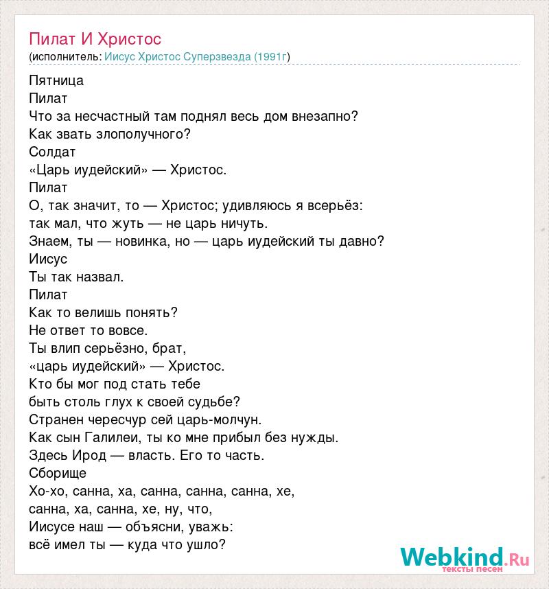 Пятница Пилат Что за несчастный там поднял весь дом внезапно? Как звать злополучного? Солдат «Царь иудейский» — Христос. Пилат О, так значит, то — Христос; удивляюсь я всерьёз: так мал, что жуть — не царь ничуть. Знаем, ты — новинка, но — царь иудейский ты давно? Иисус Ты так назвал. Пилат Как то велишь понять? Не ответ то вовсе. Ты влип серьёзно, брат, «царь иудейский» — Христос. Кто бы мог под стать тебе быть столь глух к своей судьбе? Странен чересчур сей царь-молчун. Как сын Галилеи, ты ко мне прибыл без нужды. Здесь Ирод — власть. Его то часть. Сборище Хо-хо, санна, ха, санна, санна, санна, хе, санна, ха, санна, хе, ну, что, Иисусе наш — объясни, уважь: всё имел ты — куда что ушло?