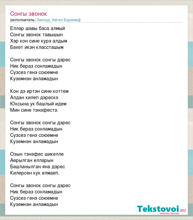 Еллар шавы баса алмый Сонгы звонок тавышын Хэр кон сине курэ алдым Бэхет икэн классташым Сонгы звонок сонгы дэрес Ник бераз сонламадын Сузсез генэ союемне Куземнэн анламадын Кон дэ иртэн сине коттем Алдан килеп дэрескэ Юксына ук башлый идем Мин сине тэнэфестэ. Сонгы звонок сонгы дэрес Ник бераз сонламадын Сузсез генэ союемне Куземнэн анламадын Озын тэнэфес шикелле Аерылган елларын Башланылган яна дэрес Килерсен кук елмаеп. Сонгы звонок сонгы дэрес Ник бераз сонламадын Сузсез генэ союемне Куземнэн анламадын