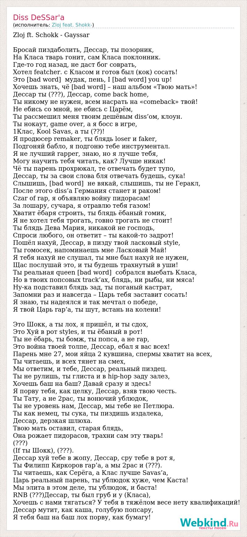 Zloj ft. Schokk - Gayssar Бросай пиздаболить, Дессар, ты позорник, На Класа тварь гонит, сам Класа поклонник. Где-то год назад, не даст бог соврать, Хотел featcher. с Класом и готов был (кок) сосать! Это [bad word] мудак, пень, I [bad word] you up! Хочешь знать, чё [bad word] – наш альбом «Твою мать»! Дессар ты (???), Дессар, сome back home, Ты никому не нужен, всем насрать на «comeback» твой! Не ебись со мной, не ебись с Царём, Ты рассмешил меня твоим дешёвым diss’ом, клоун. Ты нокаут, game over, а я босс в игре, 1Клас, Kool Savas, а ты (??)! Я продюсер remaker, ты блядь loser и faker, Подгоняй бабло, я подгоню тебе инструментал. Я не лучший rapper, знаю, но я лучше тебя, Могу научить тебя читать, как? Лучше никак! Чё ты парень прохрюкал, те отвечать будет тупо, Дессар, ты за свои слова бля отвечать будешь, сука! Слышишь, [bad word] не вякай, слышишь, ты не Геракл, После этого diss’а Германия станет и раком! Czar of rap, я объявляю войну пидорасам! За лошару, сучара, я отравлю тебя газом! Хватит ёбаря строить, ты блядь ёбаный гомик, Я не хотел тебя трогать, говно трогать не стоит! Ты блядь Дева Мария, никакой не господь, Спроси любого, он ответит – ты какой-то задрот! Пошёл нахуй, Дессар, в пизду твой ласковый style, Ты гомосек, напоминаешь мне Ласковый Май! Я тебя нахуй не слушал, ты мне был нахуй не нужен, Щас послушай это, и ты будешь трахнутый в уши! Ты реальная queen [bad word] собрался выебать Класа, Но в твоих попсовых track’ах, блядь, ни рыбы, ни мяса! Ну-ка подставил блядь зад, ты поганый кастрат, Запомни раз и навсегда – Царь тебя заставит сосать! Я знаю, ты надеялся и так мечтал о победе, Я твой Царь rap’а, ты шут, встань на колени! Это Шокк, а ты лох, я пришёл, и ты сдох, Это Хуй в рот styles, и ты ёбаный в рот! Ты не ёбарь, ты бомж, ты попса, а не rap, Это война твоей толпе, Дессар, ебал я вас всех! Парень мне 27, мои яйца 2 кувшина, спермы хватит на всех, Ты читаешь, и всех тянет на смех, Мы ответим, и тебе, Дессар, реальный пиздец. Ты не рулишь, ты глиста и в hip-hop заду залез, Хочешь баш на баш? Давай сразу и здесь! Я порву тебя, как целку, Дессар, взяв твою честь. Ты Тату, а не 2pac, ты вонючий ублюдок, Ты не уровень нам, Дессар, мы тебе не Петлюра. Ты как немец, ты сука, ты пиздишь издалека, Дессар, дерзкая шлюха. Твою мать оставил, старая блядь, Она рожает пидорасов, трахни сам эту тварь! (???) (If ты Шокк), (???). Дессар хуй тебе в жопу, Дессар, сру тебе в рот я, Ты Филипп Киркоров rap’а, а мы 2pac и (???). Ты читаешь, как Серёга, а Клас лучше Savas’а, Царь реальный парень, ты ублюдок хуже, чем Каста! Мы элита в этом деле, ты ублюдок, и баста! RNB (???)Дессар, ты был груб и у (Класа), Хочешь с нами тягаться? У тебя в тяжёлом весе нету квалификаций! Дессар мутит, как каша, голубую попсару, Я тебя баш на баш лох порву, как бумагу!