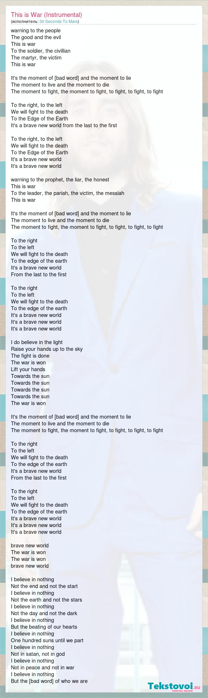 warning to the people The good and the evil This is war To the soldier, the civillian The martyr, the victim This is war It's the moment of truth and the moment to lie The moment to live and the moment to die The moment to fight, the moment to fight, to fight, to fight, to fight To the right, to the left We will fight to the death To the Edge of the Earth It's a brave new world from the last to the first To the right, to the left We will fight to the death To the Edge of the Earth It's a brave new world It's a brave new world warning to the prophet, the liar, the honest This is war To the leader, the pariah, the victim, the messiah This is war It's the moment of truth and the moment to lie The moment to live and the moment to die The moment to fight, the moment to fight, to fight, to fight, to fight To the right To the left We will fight to the death To the edge of the earth It's a brave new world From the last to the first To the right To the left We will fight to the death To the edge of the earth It's a brave new world It's a brave new world It's a brave new world I do believe in the light Raise your hands up to the sky The fight is done The war is won Lift your hands Towards the sun Towards the sun Towards the sun Towards the sun The war is won It's the moment of truth and the moment to lie The moment to live and the moment to die The moment to fight, the moment to fight, to fight, to fight, to fight To the right To the left We will fight to the death To the edge of the earth It's a brave new world From the last to the first To the right To the left We will fight to the death To the edge of the earth It's a brave new world It's a brave new world It's a brave new world brave new world The war is won The war is won brave new world I believe in nothing Not the end and not the start I believe in nothing Not the earth and not the stars I believe in nothing Not the day and not the dark I believe in nothing But the beating of our hearts I believe in nothing One hundred suns until we part I believe in nothing Not in satan, not in god I believe in nothing Not in peace and not in war I believe in nothing But the truth of who we are