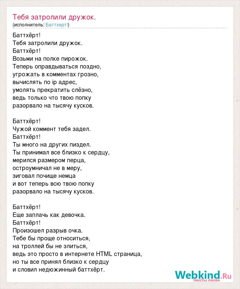 Баттхёрт! Тебя затролили дружок. Баттхёрт! Возьми на полке пирожок. Теперь оправдываться поздно, угрожать в комментах грозно, вычислять по ip адрес, умолять прекратить слёзно, ведь только что твою попку разорвало на тысячу кусков. Баттхёрт! Чужой коммент тебя задел. Баттхёрт! Ты много на других пиздел. Ты принимал все близко к сердцу, мерился размером перца, остроумничал не в меру, зиговал почище немца и вот теперь всю твою попку разорвало на тысячу кусков. Баттхёрт! Еще заплачь как девочка. Баттхёрт! Произошел разрыв очка. Тебе бы проще относиться, на троллей бы не злиться, ведь это просто в интернете HTML страница, но ты все принял близко к сердцу и словил недюжинный баттхёрт.