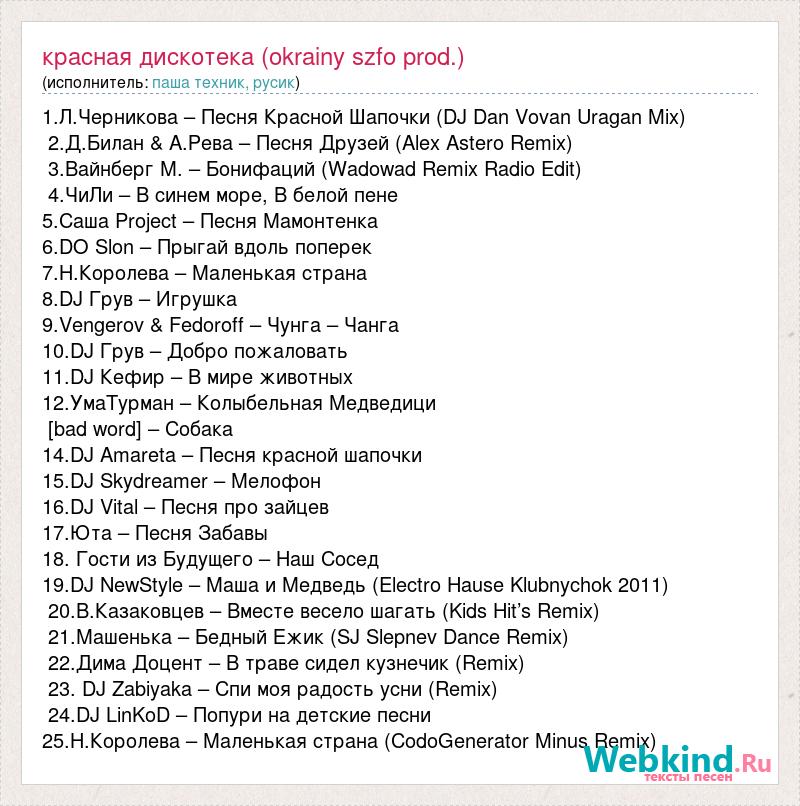1.Л.Черникова – Песня Красной Шапочки (DJ Dan Vovan Uragan Mix) 2.Д.Билан & А.Рева – Песня Друзей (Alex Astero Remix) 3.Вайнберг М. – Бонифаций (Wadowad Remix Radio Edit) 4.ЧиЛи – В синем море, В белой пене 5.Саша Project – Песня Мамонтенка 6.DО Slon – Прыгай вдоль поперек 7.Н.Королева – Маленькая страна 8.DJ Грув – Игрушка 9.Vengerov & Fedoroff – Чунга – Чанга 10.DJ Грув – Добро пожаловать 11.DJ Кефир – В мире животных 12.УмаТурман – Колыбельная Медведици [bad word] – Собака 14.DJ Amareta – Песня красной шапочки 15.DJ Skydreamer – Мелофон 16.DJ Vital – Песня про зайцев 17.Юта – Песня Забавы 18. Гости из Будущего – Наш Сосед 19.DJ NewStyle – Маша и Медведь (Electro Hause Klubnychok 2011) 20.В.Казаковцев – Вместе весело шагать (Kids Hit’s Remix) 21.Машенька – Бедный Ежик (SJ Slepnev Dance Remix) 22.Дима Доцент – В траве сидел кузнечик (Remix) 23. DJ Zabiyaka – Спи моя радость усни (Remix) 24.DJ LinKoD – Попури на детские песни 25.Н.Королева – Маленькая страна (CodoGenerator Minus Remix)