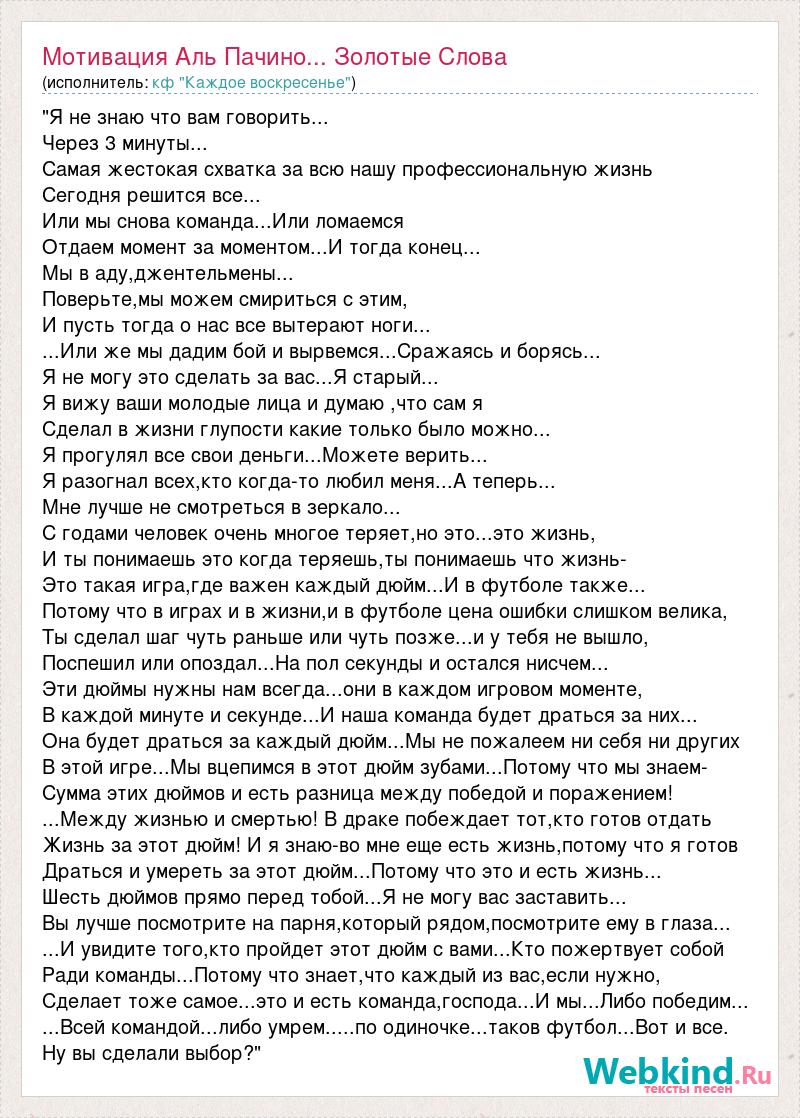 "Я не знаю что вам говорить... Через 3 минуты... Самая жестокая схватка за всю нашу профессиональную жизнь Сегодня решится все... Или мы снова команда...Или ломаемся Отдаем момент за моментом...И тогда конец... Мы в аду,джентельмены... Поверьте,мы можем смириться с этим, И пусть тогда о нас все вытерают ноги... ...Или же мы дадим бой и вырвемся...Сражаясь и борясь... Я не могу это сделать за вас...Я старый... Я вижу ваши молодые лица и думаю ,что сам я Сделал в жизни глупости какие только было можно... Я прогулял все свои деньги...Можете верить... Я разогнал всех,кто когда-то любил меня...А теперь... Мне лучше не смотреться в зеркало... С годами человек очень многое теряет,но это...это жизнь, И ты понимаешь это когда теряешь,ты понимаешь что жизнь- Это такая игра,где важен каждый дюйм...И в футболе также... Потому что в играх и в жизни,и в футболе цена ошибки слишком велика, Ты сделал шаг чуть раньше или чуть позже...и у тебя не вышло, Поспешил или опоздал...На пол секунды и остался нисчем... Эти дюймы нужны нам всегда...они в каждом игровом моменте, В каждой минуте и секунде...И наша команда будет драться за них... Она будет драться за каждый дюйм...Мы не пожалеем ни себя ни других В этой игре...Мы вцепимся в этот дюйм зубами...Потому что мы знаем- Сумма этих дюймов и есть разница между победой и поражением! ...Между жизнью и смертью! В драке побеждает тот,кто готов отдать Жизнь за этот дюйм! И я знаю-во мне еще есть жизнь,потому что я готов Драться и умереть за этот дюйм...Потому что это и есть жизнь... Шесть дюймов прямо перед тобой...Я не могу вас заставить... Вы лучше посмотрите на парня,который рядом,посмотрите ему в глаза... ...И увидите того,кто пройдет этот дюйм с вами...Кто пожертвует собой Ради команды...Потому что знает,что каждый из вас,если нужно, Сделает тоже самое...это и есть команда,господа...И мы...Либо победим... ...Всей командой...либо умрем.....по одиночке...таков футбол...Вот и все. Ну вы сделали выбор?"