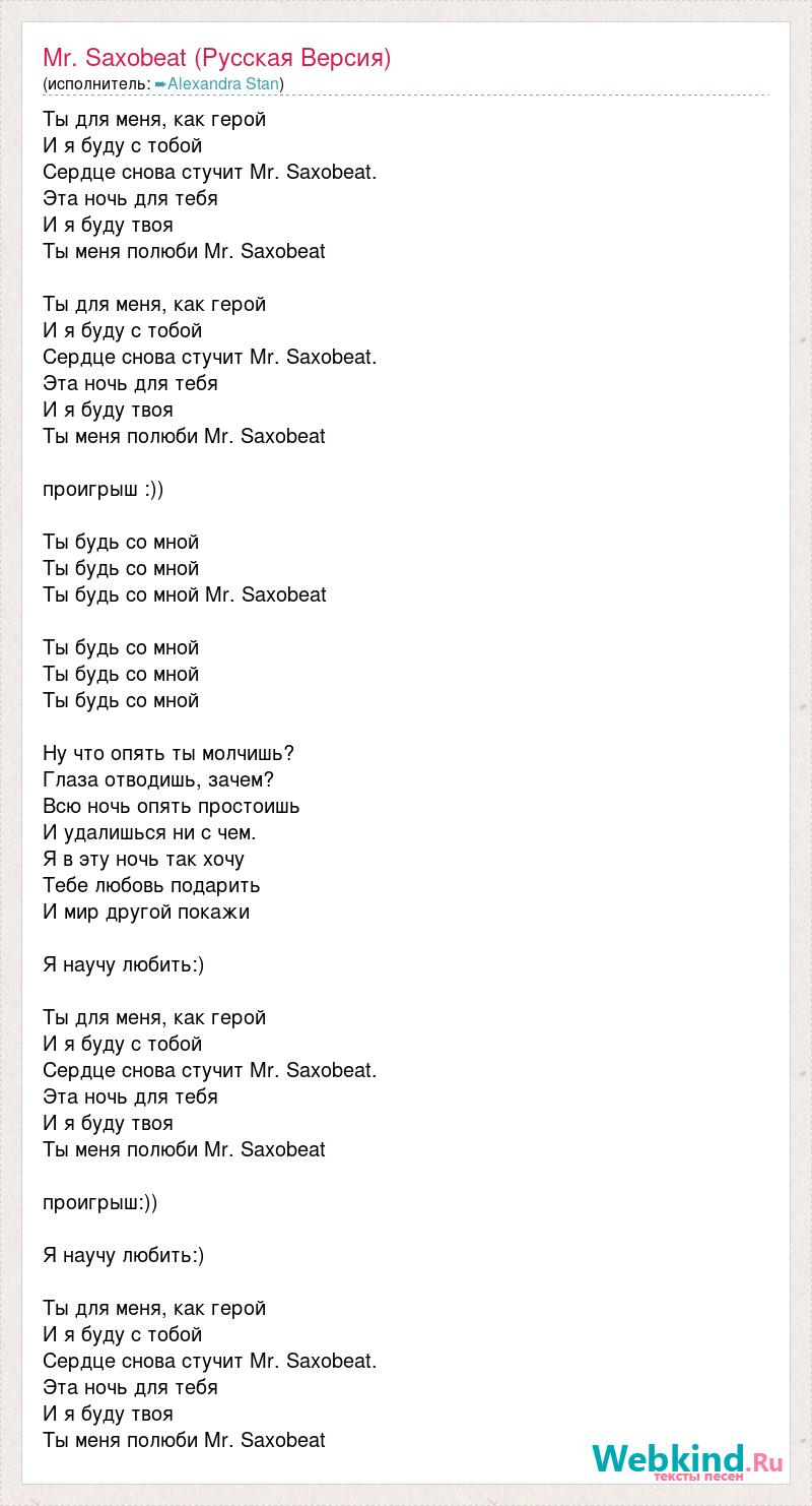 Ты для меня, как герой И я буду с тобой Сердце снова стучит Mr. Saxobeat. Эта ночь для тебя И я буду твоя Ты меня полюби Mr. Saxobeat Ты для меня, как герой И я буду с тобой Сердце снова стучит Mr. Saxobeat. Эта ночь для тебя И я буду твоя Ты меня полюби Mr. Saxobeat проигрыш :)) Ты будь со мной Ты будь со мной Ты будь со мной Mr. Saxobeat Ты будь со мной Ты будь со мной Ты будь со мной Ну что опять ты молчишь? Глаза отводишь, зачем? Всю ночь опять простоишь И удалишься ни с чем. Я в эту ночь так хочу Тебе любовь подарить И мир другой покажи Я научу любить:) Ты для меня, как герой И я буду с тобой Сердце снова стучит Mr. Saxobeat. Эта ночь для тебя И я буду твоя Ты меня полюби Mr. Saxobeat проигрыш:)) Я научу любить:) Ты для меня, как герой И я буду с тобой Сердце снова стучит Mr. Saxobeat. Эта ночь для тебя И я буду твоя Ты меня полюби Mr. Saxobeat