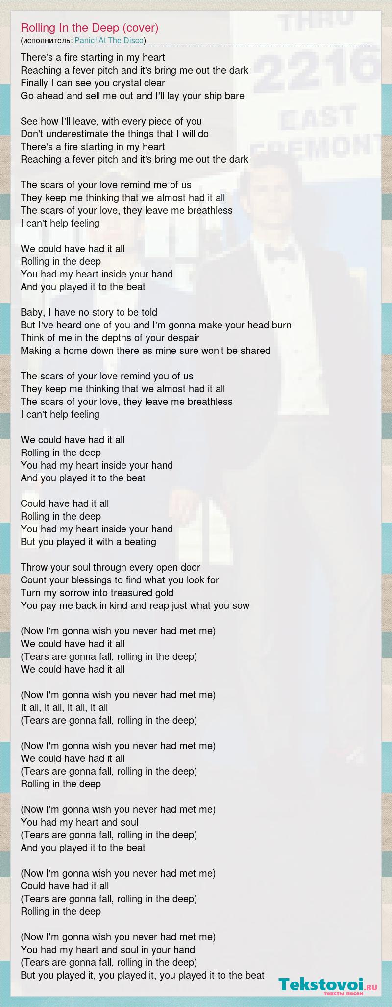 There's a fire starting in my heart Reaching a fever pitch and it's bring me out the dark Finally I can see you crystal clear Go ahead and sell me out and I'll lay your ship bare See how I'll leave, with every piece of you Don't underestimate the things that I will do There's a fire starting in my heart Reaching a fever pitch and it's bring me out the dark The scars of your love remind me of us They keep me thinking that we almost had it all The scars of your love, they leave me breathless I can't help feeling We could have had it all Rolling in the deep You had my heart inside your hand And you played it to the beat Baby, I have no story to be told But I've heard one of you and I'm gonna make your head burn Think of me in the depths of your despair Making a home down there as mine sure won't be shared The scars of your love remind you of us They keep me thinking that we almost had it all The scars of your love, they leave me breathless I can't help feeling We could have had it all Rolling in the deep You had my heart inside your hand And you played it to the beat Could have had it all Rolling in the deep You had my heart inside your hand But you played it with a beating Throw your soul through every open door Count your blessings to find what you look for Turn my sorrow into treasured gold You pay me back in kind and reap just what you sow (Now I'm gonna wish you never had met me) We could have had it all (Tears are gonna fall, rolling in the deep) We could have had it all (Now I'm gonna wish you never had met me) It all, it all, it all, it all (Tears are gonna fall, rolling in the deep) (Now I'm gonna wish you never had met me) We could have had it all (Tears are gonna fall, rolling in the deep) Rolling in the deep (Now I'm gonna wish you never had met me) You had my heart and soul (Tears are gonna fall, rolling in the deep) And you played it to the beat (Now I'm gonna wish you never had met me) Could have had it all (Tears are gonna fall, rolling in the deep) Rolling in the deep (Now I'm gonna wish you never had met me) You had my heart and soul in your hand (Tears are gonna fall, rolling in the deep) But you played it, you played it, you played it to the beat