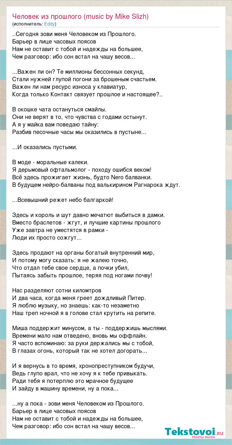 ..Сегодня зови меня Человеком из Прошлого. Барьер в лице часовых поясов Нам не оставит с тобой и надежды на большее, Чем разговор: ибо сон встал на чашу весов... ...Важен ли он? Те миллионы бессонных секунд, Стали нужней глупой погони за брошеным счастьем. Важен ли нам ресурс износа у клавиатур, Когда только Контакт связует прошлое и настоящее?.. В окошке чата остануться смайлы. Они не верят в то, что чувства с годами остынут. А я у майка вам поведаю тайну: Разбив песочные часы мы оказились в пустыне... ...И оказались пустыми. В моде - моральные калеки. Я дерьмовый офтальмолог - походу ошибся веком! Всё здесь прожигает жизнь, будто Nero балванки. В будущем нейро-балваны под валькирином Рагнарока ждут. ...Всевышний режет небо балгаркой! Здесь и король и шут давно мечатют выбиться в дамки. Вместо браслетов - жгут, и лучшие картины прошлого Уже завтра не уместятся в рамки - Люди их просто сожгут... Здесь продают на органы богатый внутренний мир, И потому могу сказать: я не жалею точно, Что отдал тебе свое сердце, а почки убил, Пытаясь забыть прошлое, теряя под ногами почву! Нас разделяют сотни киломтров И два часа, когда меня греет дождливый Питер. Я люблю музыку, но знаешь: как-то незаметно Наш треп ночной я в голове стал крутить на репите. Миша поддержит минусом, а ты - поддержишь мыслями. Времени мало нам отведено, вновь мы оффлайн. Я часто вспоминаю: за руки держались мы с тобой, В глазах огонь, который так не хотел догорать... И я вернусь в то время, хронопреступником будучи, Ведь глупо врал, что не хочу я к тебе привыкать. Ради тебя я потерплю это мрачное будущее И зайду в машину времени, ну а пока... ...ну а пока - зови меня Человеком из Прошлого. Барьер в лице часовых поясов Нам не оставит с тобой и надежды на большее, Чем разговор: ибо сон встал на чашу весов...