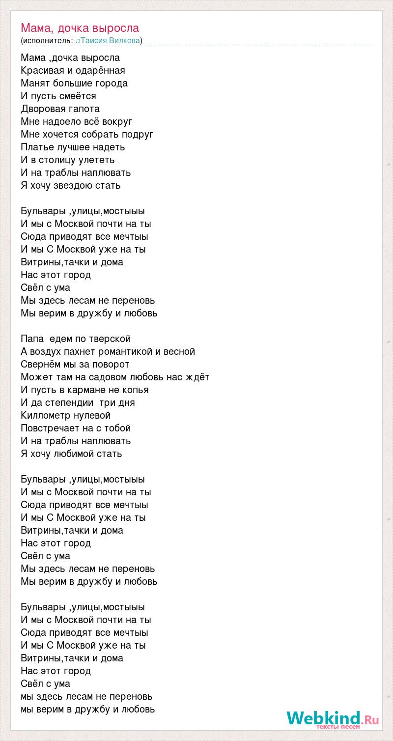 Мама ,дочка выросла Красивая и одарённая Манят большие города И пусть смеётся Дворовая гапота Мне надоело всё вокруг Мне хочется собрать подруг Платье лучшее надеть И в столицу улететь И на траблы наплювать Я хочу звездою стать Бульвары ,улицы,мостыыы И мы с Москвой почти на ты Сюда приводят все мечтыы И мы С Москвой уже на ты Витрины,тачки и дома Нас этот город Свёл с ума Мы здесь лесам не переновь Мы верим в дружбу и любовь Папа едем по тверской А воздух пахнет романтикой и весной Свернём мы за поворот Может там на садовом любовь нас ждёт И пусть в кармане не копья И да степендии три дня Киллометр нулевой Повстречает на с тобой И на траблы наплювать Я хочу любимой стать Бульвары ,улицы,мостыыы И мы с Москвой почти на ты Сюда приводят все мечтыы И мы С Москвой уже на ты Витрины,тачки и дома Нас этот город Свёл с ума Мы здесь лесам не переновь Мы верим в дружбу и любовь Бульвары ,улицы,мостыыы И мы с Москвой почти на ты Сюда приводят все мечтыы И мы С Москвой уже на ты Витрины,тачки и дома Нас этот город Свёл с ума мы здесь лесам не переновь мы верим в дружбу и любовь