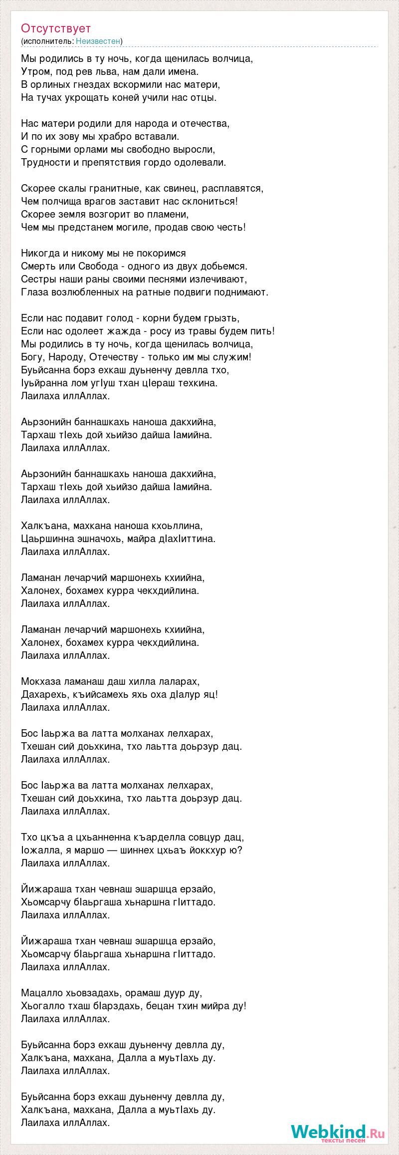 Мы родились в ту ночь, когда щенилась волчица, Утром, под рев льва, нам дали имена. В орлиных гнездах вскормили нас матери, На тучах укрощать коней учили нас отцы. Нас матери родили для народа и отечества, И по их зову мы храбро вставали. С горными орлами мы свободно выросли, Трудности и препятствия гордо одолевали. Скорее скалы гранитные, как свинец, расплавятся, Чем полчища врагов заставит нас склониться! Скорее земля возгорит во пламени, Чем мы предстанем могиле, продав свою честь! Никогда и никому мы не покоримся Смерть или Свобода - одного из двух добьемся. Сестры наши раны своими песнями излечивают, Глаза возлюбленных на ратные подвиги поднимают. Если нас подавит голод - корни будем грызть, Если нас одолеет жажда - росу из травы будем пить! Мы родились в ту ночь, когда щенилась волчица, Богу, Народу, Отечеству - только им мы служим! Буьйсанна борз ехкаш дуьненчу девлла тхо, Ӏуьйранна лом угӀуш тхан цӀераш техкина. Лаилаха иллАллах. Аьрзонийн баннашкахь наноша дакхийна, Тархаш тӀехь дой хьийзо дайша Ӏамийна. Лаилаха иллАллах. Аьрзонийн баннашкахь наноша дакхийна, Тархаш тӀехь дой хьийзо дайша Ӏамийна. Лаилаха иллАллах. Халкъана, махкана наноша кхоьллина, Цаьршинна эшначохь, майра дӀахӀиттина. Лаилаха иллАллах. Ламанан лечарчий маршонехь кхиийна, Халонех, бохамех курра чекхдийлина. Лаилаха иллАллах. Ламанан лечарчий маршонехь кхиийна, Халонех, бохамех курра чекхдийлина. Лаилаха иллАллах. Мокхаза ламанаш даш хилла лаларах, Дахарехь, къийсамехь яхь оха дӀалур яц! Лаилаха иллАллах. Бос Ӏаьржа ва латта молханах лелхарах, Тхешан сий доьхкина, тхо лаьтта доьрзур дац. Лаилаха иллАллах. Бос Ӏаьржа ва латта молханах лелхарах, Тхешан сий доьхкина, тхо лаьтта доьрзур дац. Лаилаха иллАллах. Тхо цкъа а цхьанненна къарделла совцур дац, Ӏожалла, я маршо — шиннех цхьаъ йоккхур ю? Лаилаха иллАллах. Йижараша тхан чевнаш эшаршца ерзайо, Хьомсарчу бӀаьргаша хьнаршна гӀиттадо. Лаилаха иллАллах. Йижараша тхан чевнаш эшаршца ерзайо, Хьомсарчу бӀаьргаша хьнаршна гӀиттадо. Лаилаха иллАллах. Мацалло хьовзадахь, орамаш дуур ду, Хьогалло тхаш бӀарздахь, бецан тхин мийра ду! Лаилаха иллАллах. Буьйсанна борз ехкаш дуьненчу девлла ду, Халкъана, махкана, Далла а муьтӀахь ду. Лаилаха иллАллах. Буьйсанна борз ехкаш дуьненчу девлла ду, Халкъана, махкана, Далла а муьтӀахь ду. Лаилаха иллАллах.