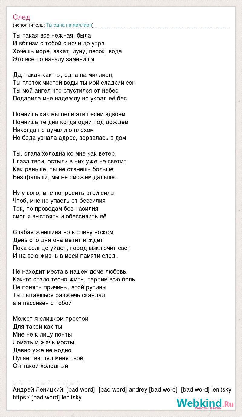 Ты такая все нежная, была И вблизи с тобой с ночи до утра Хочешь море, закат, луну, песок, вода Это все по началу заменил я Да, такая как ты, одна на миллион, Ты глоток чистой воды ты мой сладкий сон Ты мой ангел что спустился от небес, Подарила мне надежду но украл её бес Помнишь как мы пели эти песни вдвоем Помнишь те дни когда одни под дождем Никогда не думали о плохом Но беда узнала адрес, ворвалась в дом Ты, стала холодна ко мне как ветер, Глаза твои, остыли в них уже не светит Как раньше, ты не станешь больше Без фальши, мы не сможем дальше.. Ну у кого, мне попросить этой силы Чтоб, мне не упасть от бессилия Ток, по проводам без насилия смог я выстоять и обессилить её Слабая женщина но в спину ножом День ото дня она метит и ждет Пока солнце уйдет, город выключит свет И на всю жизнь в моей памяти след.. Не находит места в нашем доме любовь, Как-то стало тесно жить, терпим всю боль Не понять причины, этой рутины Ты пытаешься разжечь скандал, а я пассивен с тобой Может я слишком простой Для такой как ты Мне не к лицу понты Ломать и жечь мосты, Давно уже не модно Пугает взгляд меня твой, Он такой холодный ================== Андрей Леницкий: [bad word] [bad word] andrey [bad word] [bad word] lenitsky https:/ [bad word] lenitsky