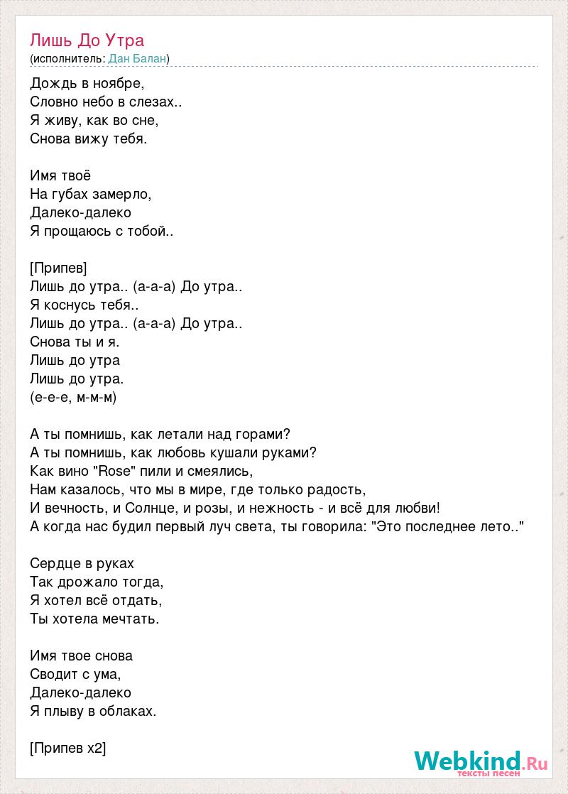 Дождь в ноябре, Словно небо в слезах.. Я живу, как во сне, Снова вижу тебя. Имя твоё На губах замерло, Далеко-далеко Я прощаюсь с тобой.. [Припев] Лишь до утра.. (а-а-а) До утра.. Я коснусь тебя.. Лишь до утра.. (а-а-а) До утра.. Снова ты и я. Лишь до утра Лишь до утра. (е-е-е, м-м-м) А ты помнишь, как летали над горами? А ты помнишь, как любовь кушали руками? Как вино "Rose" пили и смеялись, Нам казалось, что мы в мире, где только радость, И вечность, и Солнце, и розы, и нежность - и всё для любви! А когда нас будил первый луч света, ты говорила: "Это последнее лето.." Сердце в руках Так дрожало тогда, Я хотел всё отдать, Ты хотела мечтать. Имя твое снова Сводит с ума, Далеко-далеко Я плыву в облаках. [Припев x2]