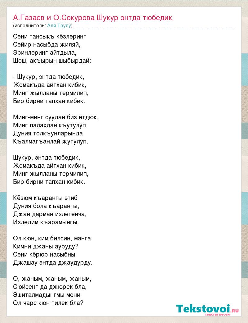 Сени тансыкъ кёзлеринг Сейир насыбда жиляй, Эринлеринг айтдыла, Шош, акъырын шыбырдай: - Шукур, энтда тюбедик, Жомакъда айтхан кибик, Минг жылланы термилип, Бир бирни тапхан кибик. Минг-минг суудан биз ётдюк, Минг палахдан къутулуп, Дуния толкъунларында Къалмагъанлай жутулуп. Шукур, энтда тюбедик, Жомакъда айтхан кибик, Минг жылланы термилип, Бир бирни тапхан кибик. Кёзюм къарангы этиб Дуния бола къарангы, Джан дарман излегенча, Изледим къарамынгы. Ол кюн, ким билсин, манга Кимни джаны ауруду? Сени кёрюр насыбны Джашау энтда джаудурду. О, жаным, жаным, жаным, Сюйсенг да джюрек бла, Эшиталмадынгмы мени Ол чарс кюн тилек бла?