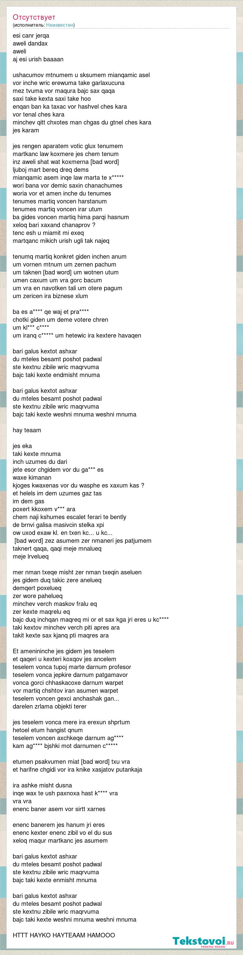 esi canr jerqa aweli dandax aweli aj esi urish baaaan ushacumov mtnumem u sksumem mianqamic asel vor inche wric erewuma take garlaxucuna mez tvuma vor maqura bajc sax qaqa saxi take kexta saxi take hoo enqan ban ka taxac vor hashvel ches kara vor tenal ches kara minchev qitt chxotes man chgas du gtnel ches kara jes karam jes rengen aparatem votic glux tenumem martkanc law koxmere jes chem tenum inz aweli shat wat koxmerna hetaqrqrum ljuboj mart bereq dreq dems mianqamic asem inqe law marta te x***** wori bana vor demic saxin chanachumes woria vor et amen inche du tenumes tenumes martiq voncen harstanum tenumes martiq voncen irar utum ba gides voncen martiq hima parqi hasnum xeloq bari xaxand chanaprov ? tenc esh u miamit mi exeq martqanc mikich urish ugli tak najeq tenumq martiq konkret giden inchen anum um vornen mtnum um zernen pachum um taknen porum um wotnen utum umen caxum um vra gorc bacum um vra en navotken tali um otere pagum um zericen ira biznese xlum ba es a**** qe waj et pra**** chotki giden um deme votere chren um kl*** c**** um iranq c***** um hetewic ira kextere havaqen bari galus kextot ashxar du mteles besamt poshot padwal ste kextnu zibile wric maqrvuma bajc taki kexte endmisht mnuma bari galus kextot ashxar du mteles besamt poshot padwal ste kextnu zibile wric maqrvuma bajc taki kexte weshni mnuma weshni mnuma hay teaam jes eka taki kexte mnuma inch uzumes du dari jete esor chgidem vor du ga*** es waxe kimanan kjoges kwaxenas vor du wasphe es xaxum kas ? et helels im dem uzumes gaz tas im dem gas poxert kkoxem v*** ara chem naji kshumes escalet ferari te bently de brnvi galisa masivcin stelka xpi ow uxod exaw kl. en txen kc... u kc... [bad word] zez asumem zer nmaneri jes patjumem taknert qaqa, qaqi meje mnalueq meje lrvelueq mer nman txeqe misht zer nman txeqin aseluen jes gidem duq takic zere anelueq demqert poxelueq zer wore pahelueq minchev verch maskov fralu eq zer kexte maqrelu eq bajc duq inchqan maqreq mi or et sax kga jri eres u kc**** taki kextov minchev verch piti apres ara takit kexte sax kjanq pti maqres ara Et amenininche jes gidem jes teselem et qaqeri u kexteri koxqov jes ancelem teselem vonca tupoj marte darnum profesor teselem vonca jepkire darnum patgamavor vonca gorci chhaskacoxe darnum warpet vor martiq chshtov iran asumen warpet teselem voncen gexci anchashak gan... darelen zrlama objekti terer jes teselem vonca mere ira erexun shprtum hetoel etum hangist qnum teselem voncen axchkeqe darnum ag**** kam ag**** bjshki mot darnumen c***** etumen psakvumen miat harust txu vra et harifne chgidi vor ira knike xasjatov putankaja ira ashke misht dusna inqe wax te ush paxnoxa hast k**** vra vra vra enenc baner asem vor sirtt xarnes enenc banerem jes hanum jri eres enenc kexter enenc zibil vo el du sus xeloq maqur martkanc jes asumem bari galus kextot ashxar du mteles besamt poshot padwal ste kextnu zibile wric maqrvuma bajc taki kexte enmisht mnuma bari galus kextot ashxar du mteles besamt poshot padwal ste kextnu zibile wric maqrvuma bajc taki kexte weshni mnuma weshni mnuma HTTT HAYKO HAYTEAAM HAMOOO