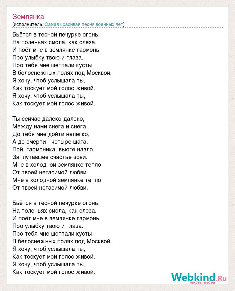 Бьётся в тесной печурке огонь, На поленьях смола, как слеза. И поёт мне в землянке гармонь Про улыбку твою и глаза. Про тебя мне шептали кусты В белоснежных полях под Москвой, Я хочу, чтоб услышала ты, Как тоскует мой голос живой. Я хочу, чтоб услышала ты, Как тоскует мой голос живой. Ты сейчас далеко-далеко, Между нами снега и снега. До тебя мне дойти нелегко, А до смерти - четыре шага. Пой, гармоника, вьюге назло, Заплутавшее счастье зови. Мне в холодной землянке тепло От твоей негасимой любви. Мне в холодной землянке тепло От твоей негасимой любви. Бьётся в тесной печурке огонь, На поленьях смола, как слеза. И поёт мне в землянке гармонь Про улыбку твою и глаза. Про тебя мне шептали кусты В белоснежных полях под Москвой, Я хочу, чтоб услышала ты, Как тоскует мой голос живой. Я хочу, чтоб услышала ты, Как тоскует мой голос живой.