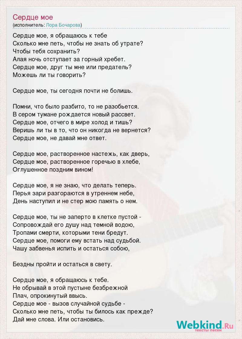 Сердце мое, я обращаюсь к тебе Сколько мне петь, чтобы не знать об утрате? Чтобы тебя сохранить? Алая ночь отступает за горный хребет. Сердце мое, друг ты мне или предатель? Можешь ли ты говорить? Сердце мое, ты сегодня почти не болишь. Помни, что было разбито, то не разобьется. В сером тумане рождается новый рассвет. Сердце мое, отчего в мире холод и тишь? Веришь ли ты в то, что он никогда не вернется? Сердце мое, не давай мне ответ. Сердце мое, растворенное настежь, как дверь, Сердце мое, растворенное горечью в хлебе, Оглушенное поздним вином! Сердце мое, я не знаю, что делать теперь. Перья зари разгораются в утреннем небе, День наступил и не стер мою память о нем. Сердце мое, ты не заперто в клетке пустой - Сопровождай его душу над темной водою, Тропами смерти, которыми тени бредут. Сердце мое, помоги ему встать над судьбой. Чашу забвенья испить и остаться собою, Бездны пройти и остаться в свету. Сердце мое, я обращаюсь к тебе. Не обрывай в этой пустыне безбрежной Плач, опрокинутый ввысь. Сердце мое - вызов случайной судьбе - Сколько мне петь, чтобы ты билось как прежде? Дай мне слова. Или остановись.