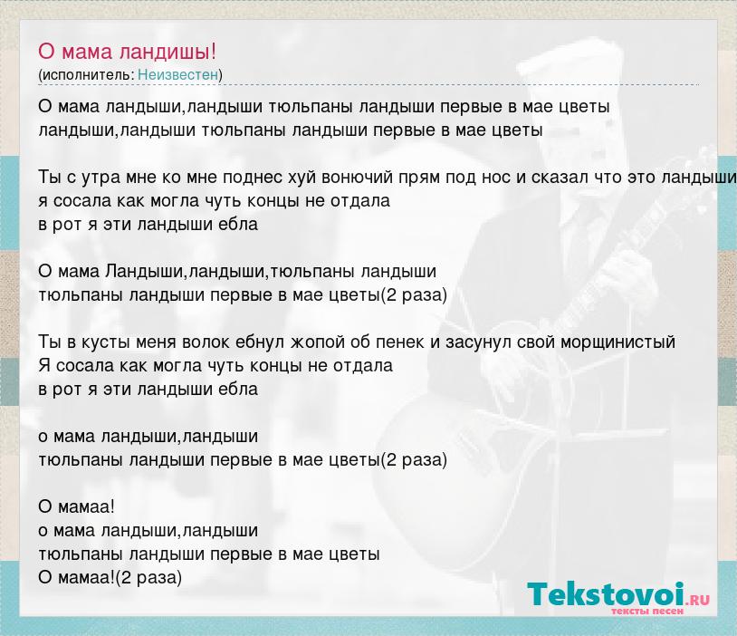 О мама ландыши,ландыши тюльпаны ландыши первые в мае цветы ландыши,ландыши тюльпаны ландыши первые в мае цветы Ты с утра мне ко мне поднес хуй вонючий прям под нос и сказал что это ландыши я сосала как могла чуть концы не отдала в рот я эти ландыши ебла О мама Ландыши,ландыши,тюльпаны ландыши тюльпаны ландыши первые в мае цветы(2 раза) Ты в кусты меня волок ебнул жопой об пенек и засунул свой морщинистый Я сосала как могла чуть концы не отдала в рот я эти ландыши ебла о мама ландыши,ландыши тюльпаны ландыши первые в мае цветы(2 раза) О мамаа! о мама ландыши,ландыши тюльпаны ландыши первые в мае цветы О мамаа!(2 раза)