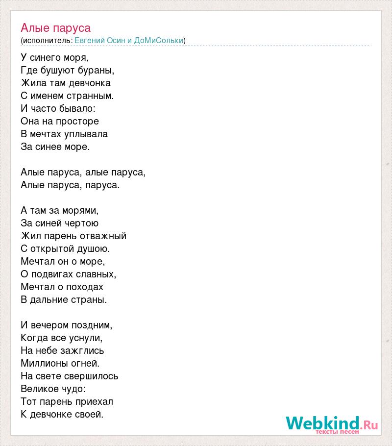 У синего моря, Где бушуют бураны, Жила там девчонка С именем странным. И часто бывало: Она на просторе В мечтах уплывала За синее море. Алые паруса, алые паруса, Алые паруса, паруса. А там за морями, За синей чертою Жил парень отважный С открытой душою. Мечтал он о море, О подвигах славных, Мечтал о походах В дальние страны. И вечером поздним, Когда все уснули, На небе зажглись Миллионы огней. На свете свершилось Великое чудо: Тот парень приехал К девчонке своей.