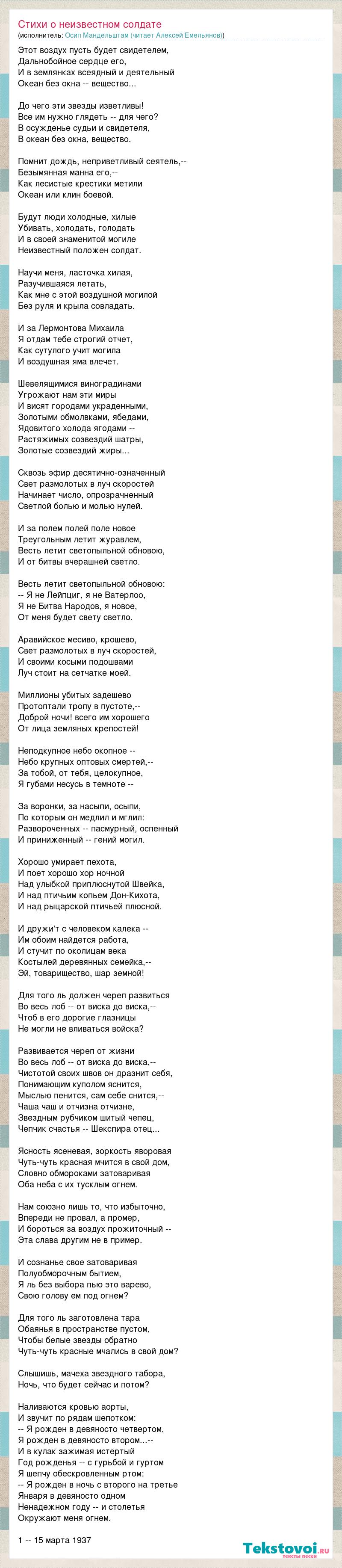 Этот воздух пусть будет свидетелем, Дальнобойное сердце его, И в землянках всеядный и деятельный Океан без окна -- вещество... До чего эти звезды изветливы! Все им нужно глядеть -- для чего? В осужденье судьи и свидетеля, В океан без окна, вещество. Помнит дождь, неприветливый сеятель,-- Безымянная манна его,-- Как лесистые крестики метили Океан или клин боевой. Будут люди холодные, хилые Убивать, холодать, голодать И в своей знаменитой могиле Неизвестный положен солдат. Научи меня, ласточка хилая, Разучившаяся летать, Как мне с этой воздушной могилой Без руля и крыла совладать. И за Лермонтова Михаила Я отдам тебе строгий отчет, Как сутулого учит могила И воздушная яма влечет. Шевелящимися виноградинами Угрожают нам эти миры И висят городами украденными, Золотыми обмолвками, ябедами, Ядовитого холода ягодами -- Растяжимых созвездий шатры, Золотые созвездий жиры... Сквозь эфир десятично-означенный Свет размолотых в луч скоростей Начинает число, опрозрачненный Светлой болью и молью нулей. И за полем полей поле новое Треугольным летит журавлем, Весть летит светопыльной обновою, И от битвы вчерашней светло. Весть летит светопыльной обновою: -- Я не Лейпциг, я не Ватерлоо, Я не Битва Народов, я новое, От меня будет свету светло. Аравийское месиво, крошево, Свет размолотых в луч скоростей, И своими косыми подошвами Луч стоит на сетчатке моей. Миллионы убитых задешево Протоптали тропу в пустоте,-- Доброй ночи! всего им хорошего От лица земляных крепостей! Неподкупное небо окопное -- Небо крупных оптовых смертей,-- За тобой, от тебя, целокупное, Я губами несусь в темноте -- За воронки, за насыпи, осыпи, По которым он медлил и мглил: Развороченных -- пасмурный, оспенный И приниженный -- гений могил. Хорошо умирает пехота, И поет хорошо хор ночной Над улыбкой приплюснутой Швейка, И над птичьим копьем Дон-Кихота, И над рыцарской птичьей плюсной. И дружи'т с человеком калека -- Им обоим найдется работа, И стучит по околицам века Костылей деревянных семейка,-- Эй, товарищество, шар земной! Для того ль должен череп развиться Во весь лоб -- от виска до виска,-- Чтоб в его дорогие глазницы Не могли не вливаться войска? Развивается череп от жизни Во весь лоб -- от виска до виска,-- Чистотой своих швов он дразнит себя, Понимающим куполом яснится, Мыслью пенится, сам себе снится,-- Чаша чаш и отчизна отчизне, Звездным рубчиком шитый чепец, Чепчик счастья -- Шекспира отец... Ясность ясеневая, зоркость яворовая Чуть-чуть красная мчится в свой дом, Словно обмороками затоваривая Оба неба с их тусклым огнем. Нам союзно лишь то, что избыточно, Впереди не провал, а промер, И бороться за воздух прожиточный -- Эта слава другим не в пример. И сознанье свое затоваривая Полуобморочным бытием, Я ль без выбора пью это варево, Свою голову ем под огнем? Для того ль заготовлена тара Обаянья в пространстве пустом, Чтобы белые звезды обратно Чуть-чуть красные мчались в свой дом? Слышишь, мачеха звездного табора, Ночь, что будет сейчас и потом? Наливаются кровью аорты, И звучит по рядам шепотком: -- Я рожден в девяносто четвертом, Я рожден в девяносто втором...-- И в кулак зажимая истертый Год рожденья -- с гурьбой и гуртом Я шепчу обескровленным ртом: -- Я рожден в ночь с второго на третье Января в девяносто одном Ненадежном году -- и столетья Окружают меня огнем. 1 -- 15 марта 1937