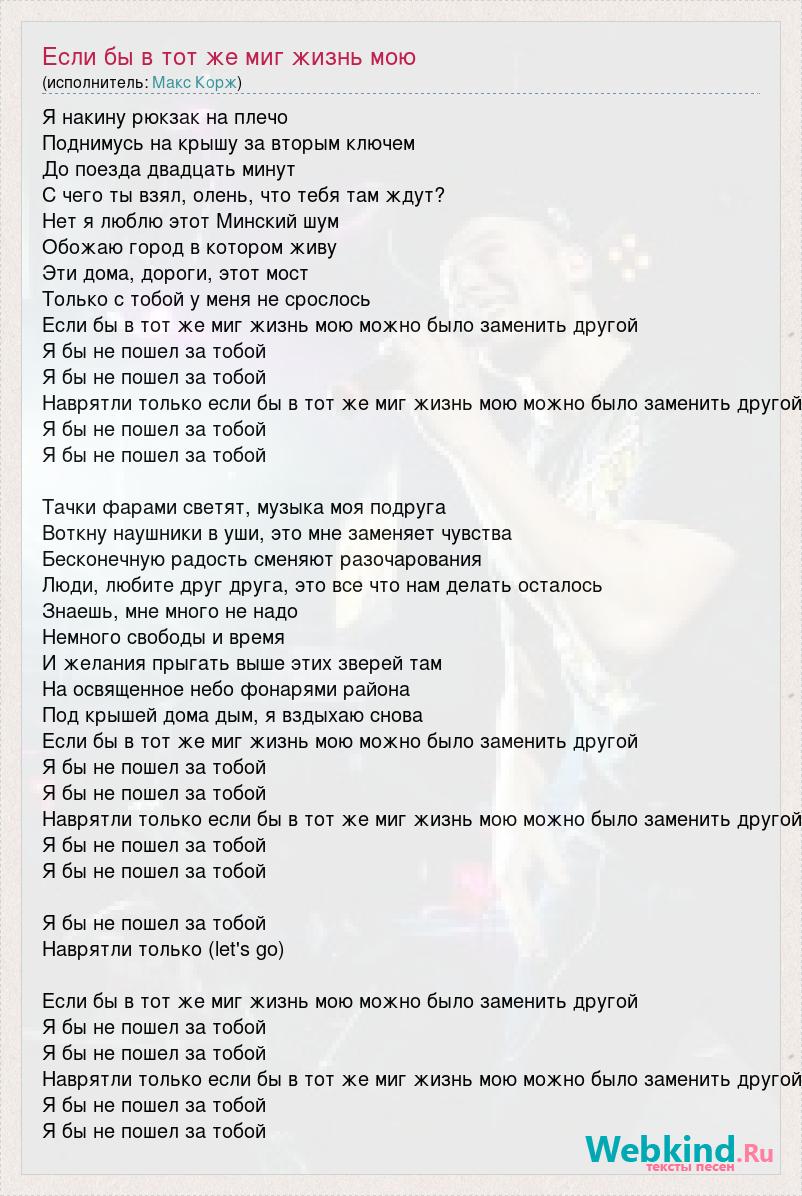 Я накину рюкзак на плечо Поднимусь на крышу за вторым ключем До поезда двадцать минут С чего ты взял, олень, что тебя там ждут? Нет я люблю этот Минский шум Обожаю город в котором живу Эти дома, дороги, этот мост Только с тобой у меня не срослось Если бы в тот же миг жизнь мою можно было заменить другой Я бы не пошел за тобой Я бы не пошел за тобой Наврятли только если бы в тот же миг жизнь мою можно было заменить другой Я бы не пошел за тобой Я бы не пошел за тобой Тачки фарами светят, музыка моя подруга Воткну наушники в уши, это мне заменяет чувства Бесконечную радость сменяют разочарования Люди, любите друг друга, это все что нам делать осталось Знаешь, мне много не надо Немного свободы и время И желания прыгать выше этих зверей там На освященное небо фонарями района Под крышей дома дым, я вздыхаю снова Если бы в тот же миг жизнь мою можно было заменить другой Я бы не пошел за тобой Я бы не пошел за тобой Наврятли только если бы в тот же миг жизнь мою можно было заменить другой Я бы не пошел за тобой Я бы не пошел за тобой Я бы не пошел за тобой Наврятли только (let's go) Если бы в тот же миг жизнь мою можно было заменить другой Я бы не пошел за тобой Я бы не пошел за тобой Наврятли только если бы в тот же миг жизнь мою можно было заменить другой Я бы не пошел за тобой Я бы не пошел за тобой