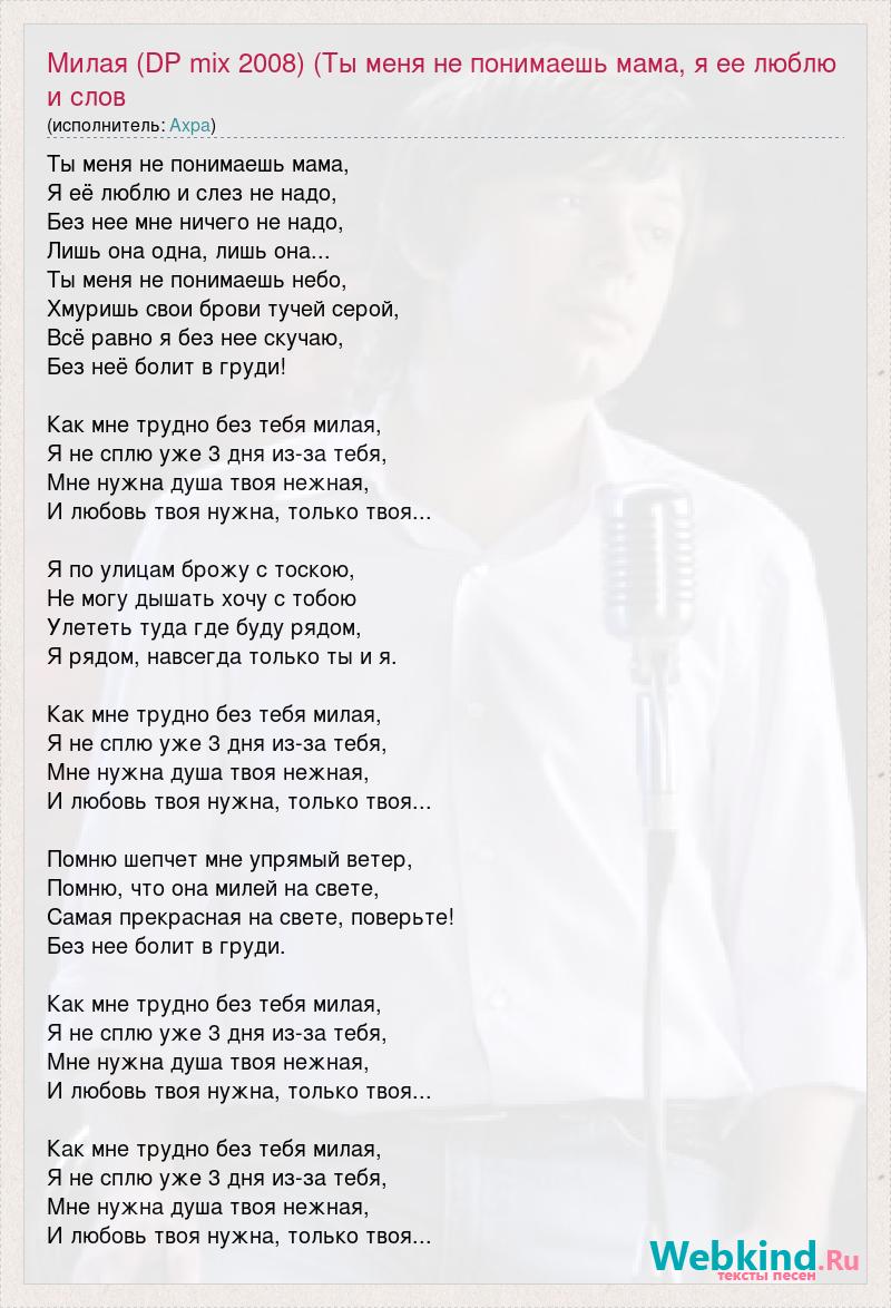Ты меня не понимаешь мама, Я её люблю и слез не надо, Без нее мне ничего не надо, Лишь она одна, лишь она... Ты меня не понимаешь небо, Хмуришь свои брови тучей серой, Всё равно я без нее скучаю, Без неё болит в груди! Как мне трудно без тебя милая, Я не сплю уже 3 дня из-за тебя, Мне нужна душа твоя нежная, И любовь твоя нужна, только твоя... Я по улицам брожу с тоскою, Не могу дышать хочу с тобою Улететь туда где буду рядом, Я рядом, навсегда только ты и я. Как мне трудно без тебя милая, Я не сплю уже 3 дня из-за тебя, Мне нужна душа твоя нежная, И любовь твоя нужна, только твоя... Помню шепчет мне упрямый ветер, Помню, что она милей на свете, Самая прекрасная на свете, поверьте! Без нее болит в груди. Как мне трудно без тебя милая, Я не сплю уже 3 дня из-за тебя, Мне нужна душа твоя нежная, И любовь твоя нужна, только твоя... Как мне трудно без тебя милая, Я не сплю уже 3 дня из-за тебя, Мне нужна душа твоя нежная, И любовь твоя нужна, только твоя...