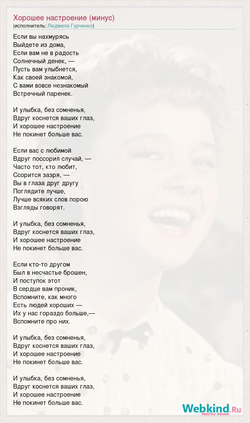 Если вы нахмурясь Выйдете из дома, Если вам не в радость Солнечный денек, — Пусть вам улыбнется, Как своей знакомой, С вами вовсе незнакомый Встречный паренек. И улыбка, без сомненья, Вдруг коснется ваших глаз, И хорошее настроение Не покинет больше вас. Если вас с любимой Вдруг поссорил случай, — Часто тот, кто любит, Ссорится зазря, — Вы в глаза друг другу Поглядите лучше, Лучше всяких слов порою Взгляды говорят. И улыбка, без сомненья, Вдруг коснется ваших глаз, И хорошее настроение Не покинет больше вас. Если кто-то другом Был в несчастье брошен, И поступок этот В сердце вам проник, Вспомните, как много Есть людей хороших — Их у нас гораздо больше,— Вспомните про них. И улыбка, без сомненья, Вдруг коснется ваших глаз, И хорошее настроение Не покинет больше вас. И улыбка, без сомненья, Вдруг коснется ваших глаз, И хорошее настроение Не покинет больше вас.