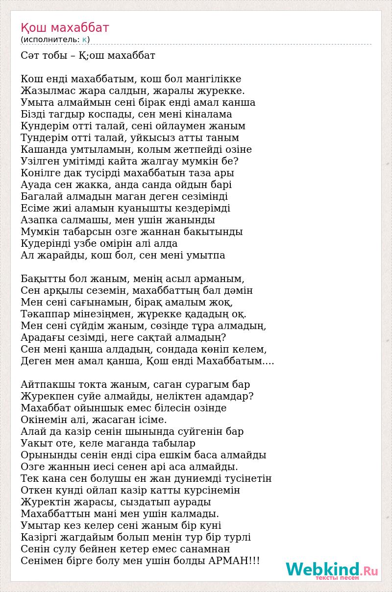 Сәт тобы – Қ;ош махаббат Кош ендi махаббатым, кош бол мангiлiкке Жазылмас жара салдын, жаралы журекке. Умыта алмаймын сенi бiрак ендi амал канша Бiздi тагдыр коспады, сен менi кiналама Кундерiм оттi талай, сенi ойлаумен жаным Тундерiм оттi талай, уйкысыз атты таным Кашанда умтыламын, колым жетпейдi озiне Узiлген умiтiмдi кайта жалгау мумкiн бе? Конiлге дак тусiрдi махаббатын таза ары Ауада сен жакка, анда санда ойдын барi Багалай алмадын маган деген сезiмiндi Есiме жиi аламын куанышты кездерiмдi Азапка салмашы, мен ушiн жанынды Мумкiн табарсын озге жаннан бакытынды Кудерiндi узбе омiрiн алi алда Ал жарайды, кош бол, сен менi умытпа Бақытты бол жаным, менің асыл арманым, Сен арқылы сеземін, махаббаттың бал дәмін Мен сені сағынамын, бірақ амалым жоқ, Тәкаппар мінезіңмен, жүрекке қададың оқ. Мен сені сүйдім жаным, сөзіңде тұра алмадың, Арадағы сезімді, неге сақтай алмадың? Сен мені қанша алдадың, сондада көніп келем, Деген мен амал қанша, Қош енді Махаббатым.... Айтпакшы токта жаным, саган сурагым бар Журекпен суйе алмайды, нелiктен адамдар? Махаббат ойыншык емес бiлесiн озiнде Окiнемiн алi, жасаган iсiме. Алай да казiр сенiн шынында суйгенiн бар Уакыт оте, келе маганда табылар Орынынды сенiн ендi сiра ешкiм баса алмайды Озге жаннын иесi сенен арi аса алмайды. Тек кана сен болушы ен жан дуниемдi тусiнетiн Откен кундi ойлап казiр катты курсiнемiн Журектiн жарасы, сыздатып аурады Махаббаттын манi мен ушiн калмады. Умытар кез келер сенi жаным бiр кунi Казiргi жагдайым болып менiн тур бiр турлi Сенiн сулу бейнен кетер емес санамнан Сенiмен бiрге болу мен ушiн болды АРМАН!!!