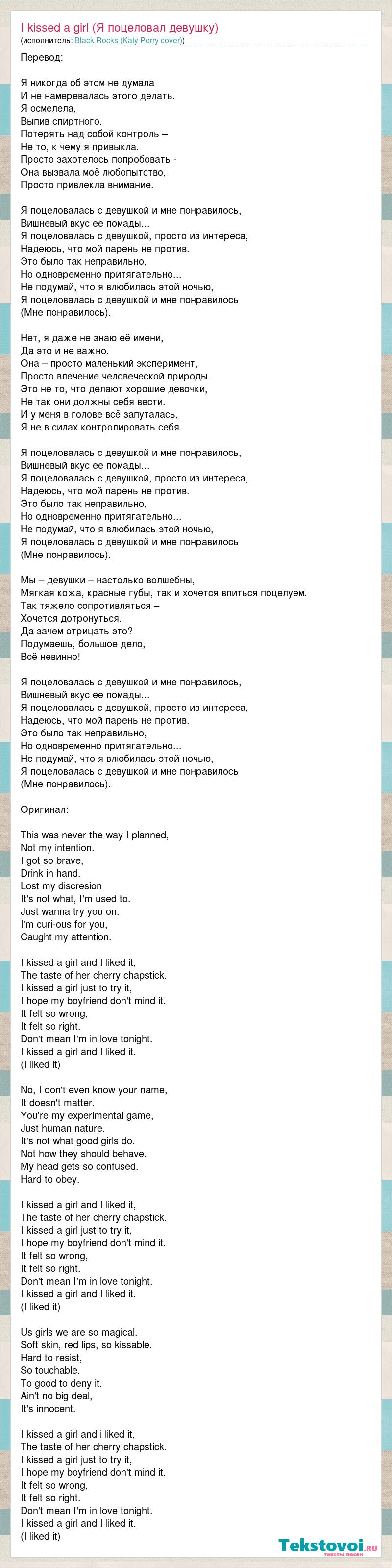 Перевод: Я никогда об этом не думала И не намеревалась этого делать. Я осмелела, Выпив спиртного. Потерять над собой контроль – Не то, к чему я привыкла. Просто захотелось попробовать - Она вызвала моё любопытство, Просто привлекла внимание. Я поцеловалась с девушкой и мне понравилось, Вишневый вкус ее помады... Я поцеловалась с девушкой, просто из интереса, Надеюсь, что мой парень не против. Это было так неправильно, Но одновременно притягательно... Не подумай, что я влюбилась этой ночью, Я поцеловалась с девушкой и мне понравилось (Мне понравилось). Нет, я даже не знаю её имени, Да это и не важно. Она – просто маленький эксперимент, Просто влечение человеческой природы. Это не то, что делают хорошие девочки, Не так они должны себя вести. И у меня в голове всё запуталась, Я не в силах контролировать себя. Я поцеловалась с девушкой и мне понравилось, Вишневый вкус ее помады... Я поцеловалась с девушкой, просто из интереса, Надеюсь, что мой парень не против. Это было так неправильно, Но одновременно притягательно... Не подумай, что я влюбилась этой ночью, Я поцеловалась с девушкой и мне понравилось (Мне понравилось). Мы – девушки – настолько волшебны, Мягкая кожа, красные губы, так и хочется впиться поцелуем. Так тяжело сопротивляться – Хочется дотронуться. Да зачем отрицать это? Подумаешь, большое дело, Всё невинно! Я поцеловалась с девушкой и мне понравилось, Вишневый вкус ее помады... Я поцеловалась с девушкой, просто из интереса, Надеюсь, что мой парень не против. Это было так неправильно, Но одновременно притягательно... Не подумай, что я влюбилась этой ночью, Я поцеловалась с девушкой и мне понравилось (Мне понравилось). Оригинал: This was never the way I planned, Not my intention. I got so brave, Drink in hand. Lost my discresion It's not what, I'm used to. Just wanna try you on. I'm curi-ous for you, Caught my attention. I kissed a girl and I liked it, The taste of her cherry chapstick. I kissed a girl just to try it, I hope my boyfriend don't mind it. It felt so wrong, It felt so right. Don't mean I'm in love tonight. I kissed a girl and I liked it. (I liked it) No, I don't even know your name, It doesn't matter. You're my experimental game, Just human nature. It's not what good girls do. Not how they should behave. My head gets so confused. Hard to obey. I kissed a girl and I liked it, The taste of her cherry chapstick. I kissed a girl just to try it, I hope my boyfriend don't mind it. It felt so wrong, It felt so right. Don't mean I'm in love tonight. I kissed a girl and I liked it. (I liked it) Us girls we are so magical. Soft skin, red lips, so kissable. Hard to resist, So touchable. To good to deny it. Ain't no big deal, It's innocent. I kissed a girl and i liked it, The taste of her cherry chapstick. I kissed a girl just to try it, I hope my boyfriend don't mind it. It felt so wrong, It felt so right. Don't mean I'm in love tonight. I kissed a girl and I liked it. (I liked it)