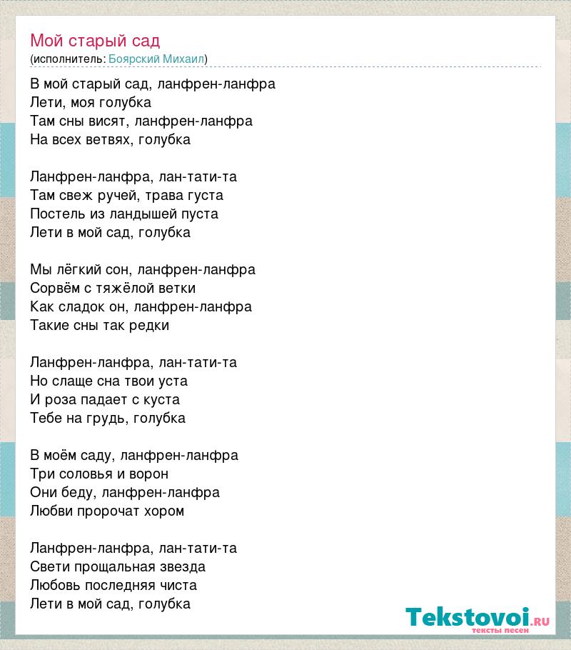 В мой старый сад, ланфрен-ланфра Лети, моя голубка Там сны висят, ланфрен-ланфра На всех ветвях, голубка Ланфрен-ланфра, лан-тати-та Там свеж ручей, трава густа Постель из ландышей пуста Лети в мой сад, голубка Мы лёгкий сон, ланфрен-ланфра Сорвём с тяжёлой ветки Как сладок он, ланфрен-ланфра Такие сны так редки Ланфрен-ланфра, лан-тати-та Но слаще сна твои уста И роза падает с куста Тебе на грудь, голубка В моём саду, ланфрен-ланфра Три соловья и ворон Они беду, ланфрен-ланфра Любви пророчат хором Ланфрен-ланфра, лан-тати-та Свети прощальная звезда Любовь последняя чиста Лети в мой сад, голубка