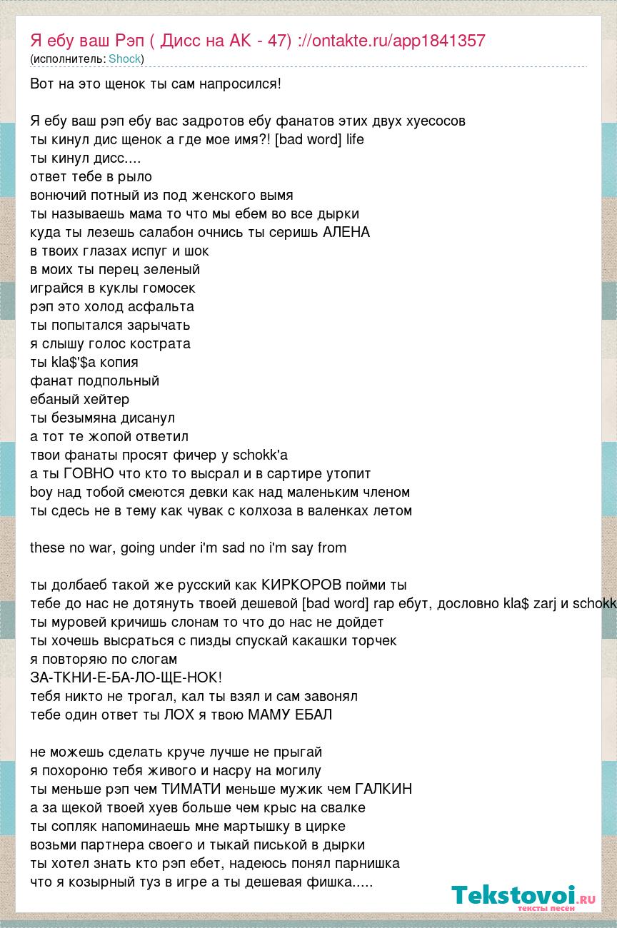 Вот на это щенок ты сам напросился! Я ебу ваш рэп ебу вас задротов ебу фанатов этих двух хуесосов ты кинул дис щенок а где мое имя?! [bad word] life ты кинул дисс.... ответ тебе в рыло вонючий потный из под женского вымя ты называешь мама то что мы ебем во все дырки куда ты лезешь салабон очнись ты серишь АЛЕНА в твоих глазах испуг и шок в моих ты перец зеленый играйся в куклы гомосек рэп это холод асфальта ты попытался зарычать я слышу голос кострата ты kla$'$a копия фанат подпольный ебаный хейтер ты безымяна дисанул а тот те жопой ответил твои фанаты просят фичер у schokk'a а ты ГОВНО что кто то высрал и в сартире утопит boy над тобой смеются девки как над маленьким членом ты сдесь не в тему как чувак с колхоза в валенках летом these no war, going under i'm sad no i'm say from ты долбаеб такой же русский как КИРКОРОВ пойми ты тебе до нас не дотянуть твоей дешевой зачиткой rus rap ебут, дословно kla$ zarj и schokk ты муровей кричишь слонам то что до нас не дойдет ты хочешь высраться с пизды спускай какашки торчек я повторяю по слогам ЗА-ТКНИ-Е-БА-ЛО-ЩЕ-НОК! тебя никто не трогал, кал ты взял и сам завонял тебе один ответ ты ЛОХ я твою МАМУ ЕБАЛ не можешь сделать круче лучше не прыгай я похороню тебя живого и насру на могилу ты меньше рэп чем ТИМАТИ меньше мужик чем ГАЛКИН а за щекой твоей хуев больше чем крыс на свалке ты сопляк напоминаешь мне мартышку в цирке возьми партнера своего и тыкай писькой в дырки ты хотел знать кто рэп ебет, надеюсь понял парнишка что я козырный туз в игре а ты дешевая фишка.....