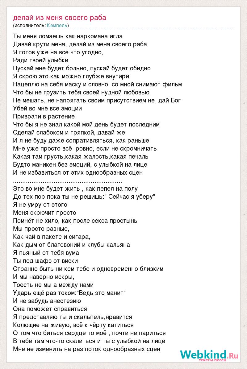 Ты меня ломаешь как наркомана игла Давай крути меня, делай из меня своего раба Я готов уже на всё что угодно, Ради твоей улыбки Пускай мне будет больно, пускай будет обидно Я скрою это как можно глубже внутири Нацеплю на себя маску и словно со мной снимают фильм Что бы не грузить тебя своей нудной любовью Не мешать, не напрягать своим присутствием не дай Бог Убей во мне все эмоции Приврати в растение Что бы я не знал какой мой день будет последним Сделай слабоком и тряпкой, давай же И я не буду даже сопративляться, как раньше Мне уже просто всё ровно, если не скромничать Какая там грусть,какая жалость,какая печаль Будто маникен без эмоций, с улыбкой на лице И не избавиться от этих однообразных сцен ........................................................... Это во мне будет жить , как пепел на полу До тех пор пока ты не решишь:" Сейчас я уберу" Я не умру от этого Меня скрючит просто Помнёт не хило, как после секса простынь Мы просто разные, Как чай в пакете и сигара, Как дым от благовоний и клубы кальяна Я пьяный от тебя вума Ты под шафэ от виски Странно быть ни кем тебе и одновременно близким И мы наверно искры, Тоесть не мы а между нами Ударь ещё раз током:"Ведь это манит" И не забудь анестезию Она поможет справиться Я представляю ты и скальпель,нравится Колющие на живую, всё к чёрту катиться О том что биться сердце то моё , почти не париться В тебе там что-то скалиться и ты с улыбкой на лице Мне не изменить на раз поток однообразных сцен