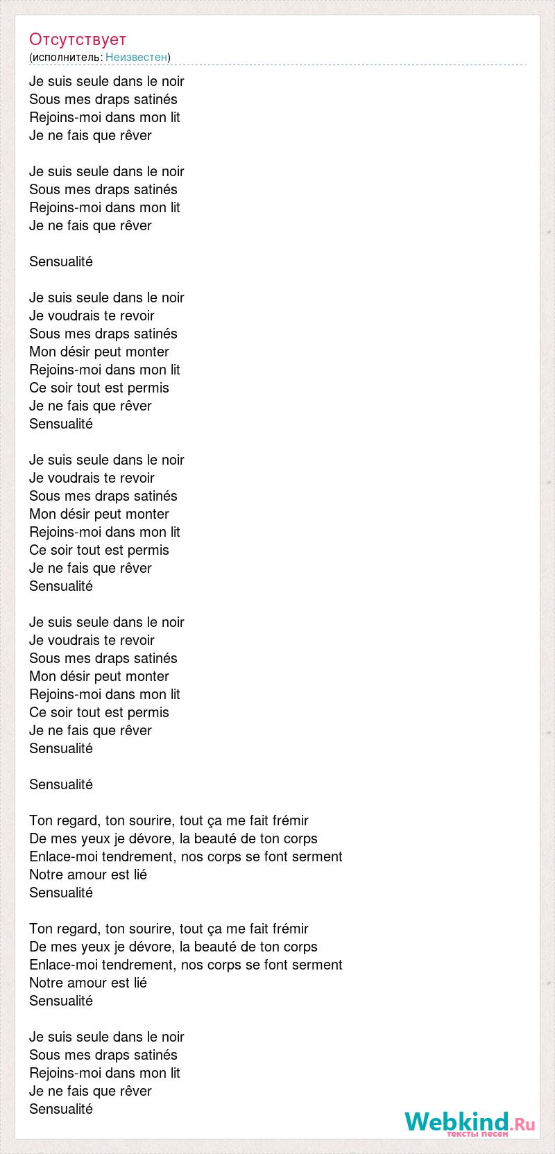 Je suis seule dans le noir Sous mes draps satinés Rejoins-moi dans mon lit Je ne fais que rêver Je suis seule dans le noir Sous mes draps satinés Rejoins-moi dans mon lit Je ne fais que rêver Sensualité Je suis seule dans le noir Je voudrais te revoir Sous mes draps satinés Mon désir peut monter Rejoins-moi dans mon lit Ce soir tout est permis Je ne fais que rêver Sensualité Je suis seule dans le noir Je voudrais te revoir Sous mes draps satinés Mon désir peut monter Rejoins-moi dans mon lit Ce soir tout est permis Je ne fais que rêver Sensualité Je suis seule dans le noir Je voudrais te revoir Sous mes draps satinés Mon désir peut monter Rejoins-moi dans mon lit Ce soir tout est permis Je ne fais que rêver Sensualité Sensualité Ton regard, ton sourire, tout ça me fait frémir De mes yeux je dévore, la beauté de ton corps Enlace-moi tendrement, nos corps se font serment Notre amour est lié Sensualité Ton regard, ton sourire, tout ça me fait frémir De mes yeux je dévore, la beauté de ton corps Enlace-moi tendrement, nos corps se font serment Notre amour est lié Sensualité Je suis seule dans le noir Sous mes draps satinés Rejoins-moi dans mon lit Je ne fais que rêver Sensualité