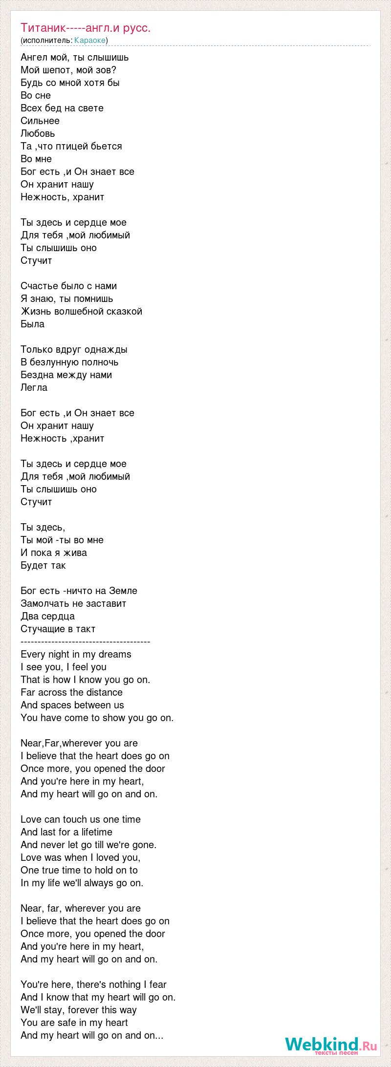 Ангел мой, ты слышишь Мой шепот, мой зов? Будь со мной хотя бы Во сне Всех бед на свете Сильнее Любовь Та ,что птицей бьется Во мне Бог есть ,и Он знает все Он хранит нашу Нежность, хранит Ты здесь и сердце мое Для тебя ,мой любимый Ты слышишь оно Стучит Счастье было с нами Я знаю, ты помнишь Жизнь волшебной сказкой Была Только вдруг однажды В безлунную полночь Бездна между нами Легла Бог есть ,и Он знает все Он хранит нашу Нежность ,хранит Ты здесь и сердце мое Для тебя ,мой любимый Ты слышишь оно Стучит Ты здесь, Ты мой -ты во мне И пока я жива Будет так Бог есть -ничто на Земле Замолчать не заставит Два сердца Стучащие в такт -------------------------------------- Every night in my dreams I see you, I feel you That is how I know you go on. Far across the distance And spaces between us You have come to show you go on. Near,Far,wherever you are I believe that the heart does go on Once more, you opened the door And you're here in my heart, And my heart will go on and on. Love can touch us one time And last for a lifetime And never let go till we're gone. Love was when I loved you, One true time to hold on to In my life we'll always go on. Near, far, wherever you are I believe that the heart does go on Once more, you opened the door And you're here in my heart, And my heart will go on and on. You're here, there's nothing I fear And I know that my heart will go on. We'll stay, forever this way You are safe in my heart And my heart will go on and on...