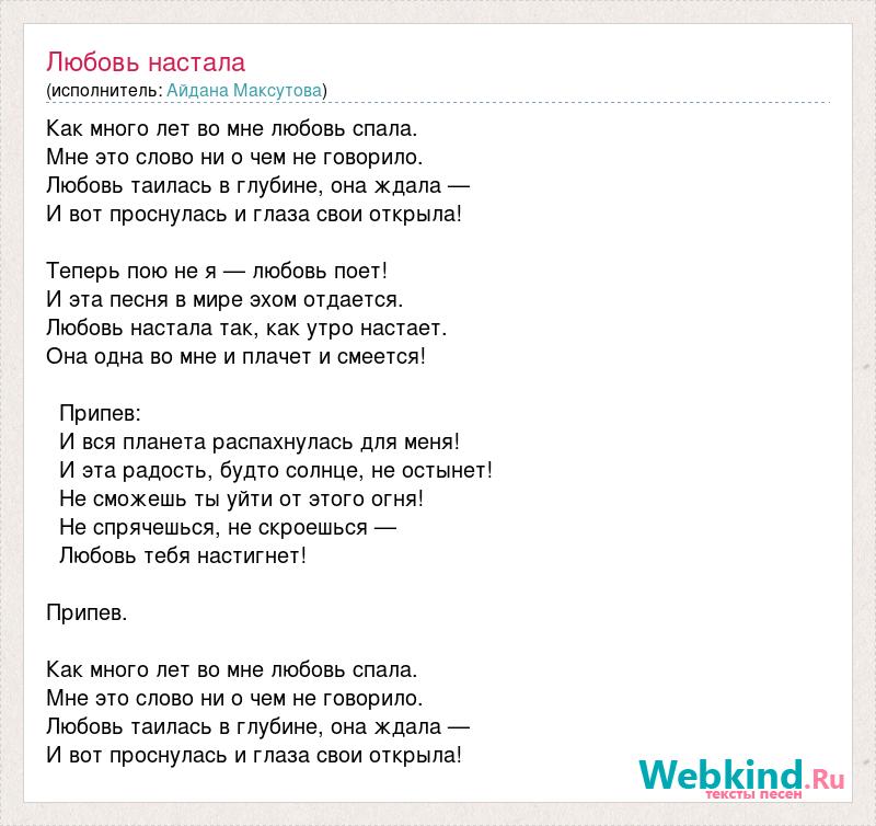 Как много лет во мне любовь спала. Мне это слово ни о чем не говорило. Любовь таилась в глубине, она ждала — И вот проснулась и глаза свои открыла! Теперь пою не я — любовь поет! И эта песня в мире эхом отдается. Любовь настала так, как утро настает. Она одна во мне и плачет и смеется! Припев: И вся планета распахнулась для меня! И эта радость, будто солнце, не остынет! Не сможешь ты уйти от этого огня! Не спрячешься, не скроешься — Любовь тебя настигнет! Припев. Как много лет во мне любовь спала. Мне это слово ни о чем не говорило. Любовь таилась в глубине, она ждала — И вот проснулась и глаза свои открыла!