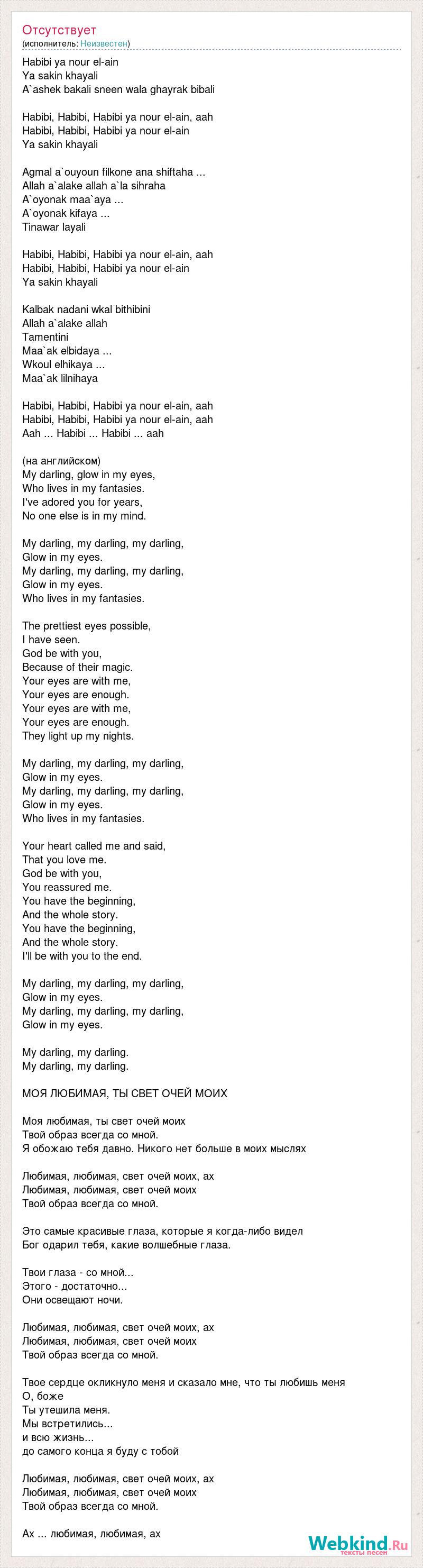 Habibi ya nour el-ain Ya sakin khayali A`ashek bakali sneen wala ghayrak bibali Habibi, Habibi, Habibi ya nour el-ain, aah Habibi, Habibi, Habibi ya nour el-ain Ya sakin khayali Agmal a`ouyoun filkone ana shiftaha ... Allah a`alake allah a`la sihraha A`oyonak maa`aya ... A`oyonak kifaya ... Tinawar layali Habibi, Habibi, Habibi ya nour el-ain, aah Habibi, Habibi, Habibi ya nour el-ain Ya sakin khayali Kalbak nadani wkal bithibini Allah a`alake allah Tamentini Maa`ak elbidaya ... Wkoul elhikaya ... Maa`ak lilnihaya Habibi, Habibi, Habibi ya nour el-ain, aah Habibi, Habibi, Habibi ya nour el-ain, aah Aah ... Habibi ... Habibi ... aah (на английском) My darling, glow in my eyes, Who lives in my fantasies. I've adored you for years, No one else is in my mind. My darling, my darling, my darling, Glow in my eyes. My darling, my darling, my darling, Glow in my eyes. Who lives in my fantasies. The prettiest eyes possible, I have seen. God be with you, Because of their magic. Your eyes are with me, Your eyes are enough. Your eyes are with me, Your eyes are enough. They light up my nights. My darling, my darling, my darling, Glow in my eyes. My darling, my darling, my darling, Glow in my eyes. Who lives in my fantasies. Your heart called me and said, That you love me. God be with you, You reassured me. You have the beginning, And the whole story. You have the beginning, And the whole story. I'll be with you to the end. My darling, my darling, my darling, Glow in my eyes. My darling, my darling, my darling, Glow in my eyes. My darling, my darling. My darling, my darling. МОЯ ЛЮБИМАЯ, ТЫ СВЕТ ОЧЕЙ МОИХ Моя любимая, ты свет очей моих Твой образ всегда со мной. Я обожаю тебя давно. Никого нет больше в моих мыслях Любимая, любимая, свет очей моих, ах Любимая, любимая, свет очей моих Твой образ всегда со мной. Это самые красивые глаза, которые я когда-либо видел Бог одарил тебя, какие волшебные глаза. Твои глаза - со мной... Этого - достаточно... Они освещают ночи. Любимая, любимая, свет очей моих, ах Любимая, любимая, свет очей моих Твой образ всегда со мной. Твое сердце окликнуло меня и сказало мне, что ты любишь меня О, боже Ты утешила меня. Мы встретились... и всю жизнь... до самого конца я буду с тобой Любимая, любимая, свет очей моих, ах Любимая, любимая, свет очей моих Твой образ всегда со мной. Ах ... любимая, любимая, ах