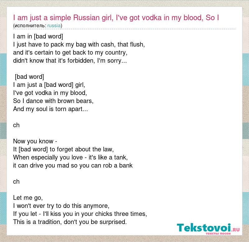I am in a rush, I just have to pack my bag with cash, that flush, and it's certain to get back to my country, didn't know that it's forbidden, I'm sorry... Chorus: I am just a simple Russian girl, I've got vodka in my blood, So I dance with brown bears, And my soul is torn apart... ch Now you know - It is common to forget about the law, When especially you love - it's like a tank, it can drive you mad so you can rob a bank ch Let me go, I won't ever try to do this anymore, If you let - I'll kiss you in your chicks three times, This is a tradition, don't you be surprised.