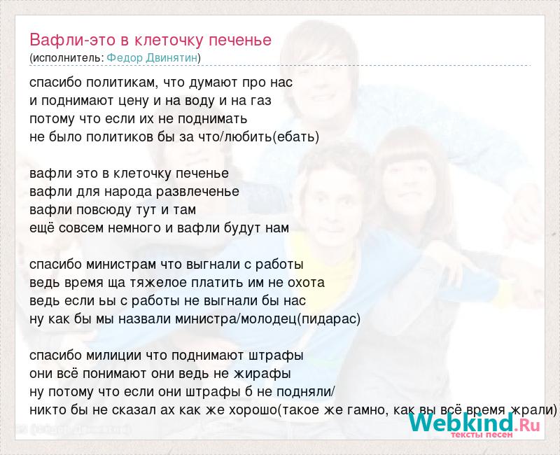 спасибо политикам, что думают про нас и поднимают цену и на воду и на газ потому что если их не поднимать не было политиков бы за что/любить(ебать) вафли это в клеточку печенье вафли для народа развлеченье вафли повсюду тут и там ещё совсем немного и вафли будут нам спасибо министрам что выгнали с работы ведь время ща тяжелое платить им не охота ведь если ьы с работы не выгнали бы нас ну как бы мы назвали министра/молодец(пидарас) спасибо милиции что поднимают штрафы они всё понимают они ведь не жирафы ну потому что если они штрафы б не подняли/ никто бы не сказал ах как же хорошо(такое же гамно, как вы всё время жрали)