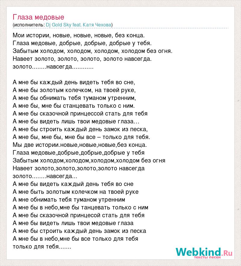 Мои истории, новые, новые, новые, без конца. Глаза медовые, добрые, добрые, добрые у тебя. Забытым холодом, холодом, холодом, холодом без огня. Навеет золото, золото, золото, золото навсегда. золото........навсегда............ А мне бы каждый день видеть тебя во сне, А мне бы золотым колечком, на твоей руке, А мне бы обнимать тебя туманом утренним, А мне бы, мне бы станцевать только с ним. А мне бы сказочной принцессой стать для тебя А мне бы видеть лишь твои медовые глаза… А мне бы строить каждый день замок из песка, А мне бы, мне бы, мне бы все – только для тебя. Мы две истории.новые,новые,новые,без конца. Глаза медовые,добрые,добрые,добрые у тебя Забытым холодом,холодом,холодом,холодом без огня Навеет золото,золото,золото,золото навсегда золото........навсегда... А мне бы видеть каждый день тебя во сне А мне быть золотым колечком на твоей руке А мне обнимать тебя туманом утренним А мне бы в небо,мне бы танцевать только с ним А мне бы сказочной принцесой стать для тебя А мне бы видеть лишь твои медовые глаза А мне бы строить каждый день замок из песка А мне бы в небо,мне бы все только для тебя только для тебя.......