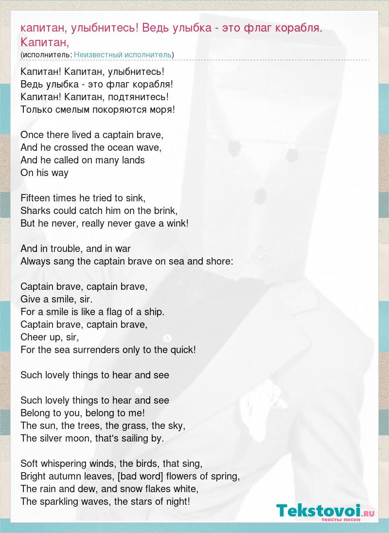 Капитан! Капитан, улыбнитесь! Ведь улыбка - это флаг корабля! Капитан! Капитан, подтянитесь! Только смелым покоряются моря! Once there lived a captain brave, And he crossed the ocean wave, And he called on many lands On his way Fifteen times he tried to sink, Sharks could catch him on the brink, But he never, really never gave a wink! And in trouble, and in war Always sang the captain brave on sea and shore: Captain brave, captain brave, Give a smile, sir. For a smile is like a flag of a ship. Captain brave, captain brave, Cheer up, sir, For the sea surrenders only to the quick! Such lovely things to hear and see Such lovely things to hear and see Belong to you, belong to me! The sun, the trees, the grass, the sky, The silver moon, that's sailing by. Soft whispering winds, the birds, that sing, Bright autumn leaves, [bad word] flowers of spring, The rain and dew, and snow flakes white, The sparkling waves, the stars of night!