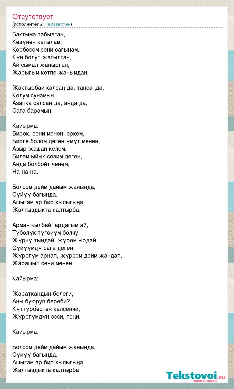 Бактыма табылган, Көзүңөн кагылам, Көрбөсөм сени сагынам. Күн болуп жагылган, Ай сымал жаңырган, Жарыгым кетпе жанымдан. Жактырбай калсаң да, тансаңда, Колум сунамын. Азапка салсаң да, анда да, Сага барамын. Кайырма: Бирок, сени менен, эркем, Бирге болом деген үмүт менен, Азыр жашап келем. Билем ыйык сезим деген, Анда болбойт ченем, На-на-на. Болсом дейм дайым жаныңда, Сүйүү багында. Ашыгам ар бир кылыгыңа, Жалгыздыкта калтырба. Арман кылбай, ардагым ай, Түбөлүк түгөйүм болчу. Жүрчү тыңдай, жүрөм ырдай, Сүйүүмдү сага деген. Жүрөгүм арнап, жүрсөм дейм жандап, Жарашып сени менен. Кайырма: Жараткандын белеги, Аны буюруп береби? Күттүрбөстөн келсеңчи, Жүрөгүмдүн ээси, теңи. Кайырма: Болсом дейм дайым жаныңда, Сүйүү багында. Ашыгам ар бир кылыгыңа, Жалгыздыкта калтырба