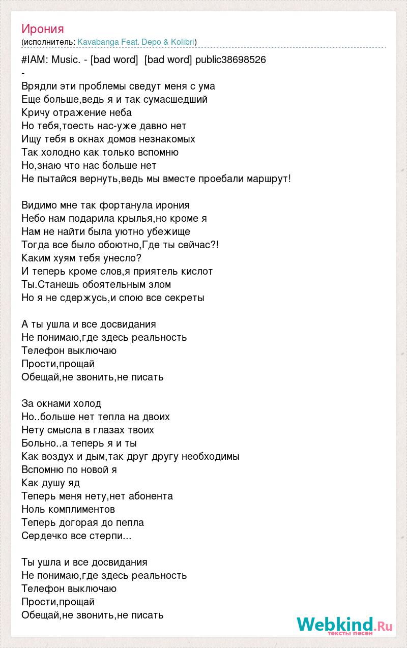 #IAM: Music. - [bad word] [bad word] public38698526 - Врядли эти проблемы сведут меня с ума Еще больше,ведь я и так сумасшедший Кричу отражение неба Но тебя,тоесть нас-уже давно нет Ищу тебя в окнах домов незнакомых Так холодно как только вспомню Но,знаю что нас больше нет Не пытайся вернуть,ведь мы вместе проебали маршрут! Видимо мне так фортанула ирония Небо нам подарила крылья,но кроме я Нам не найти была уютно убежище Тогда все было обоютно,Где ты сейчас?! Каким хуям тебя унесло? И теперь кроме слов,я приятель кислот Ты.Станешь обоятельным злом Но я не сдержусь,и спою все секреты А ты ушла и все досвидания Не понимаю,где здесь реальность Телефон выключаю Прости,прощай Обещай,не звонить,не писать За окнами холод Но..больше нет тепла на двоих Нету смысла в глазах твоих Больно..а теперь я и ты Как воздух и дым,так друг другу необходимы Вспомню по новой я Как душу яд Теперь меня нету,нет абонента Ноль комплиментов Теперь догорая до пепла Сердечко все стерпи... Ты ушла и все досвидания Не понимаю,где здесь реальность Телефон выключаю Прости,прощай Обещай,не звонить,не писать