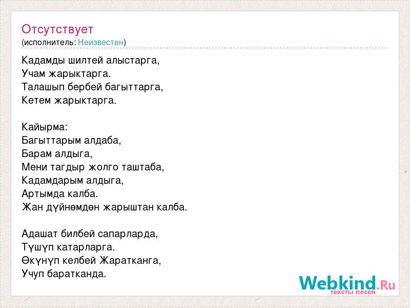 Кадамды шилтей алыстарга, Учам жарыктарга. Талашып бербей багыттарга, Кетем жарыктарга. Кайырма: Багыттарым алдаба, Барам алдыга, Мени тагдыр жолго таштаба, Кадамдарым алдыга, Артымда калба. Жан дүйнөмдөн жарыштан калба. Адашат билбей сапарларда, Түшүп катарларга. Өкүнүп келбей Жаратканга, Учуп баратканда.
