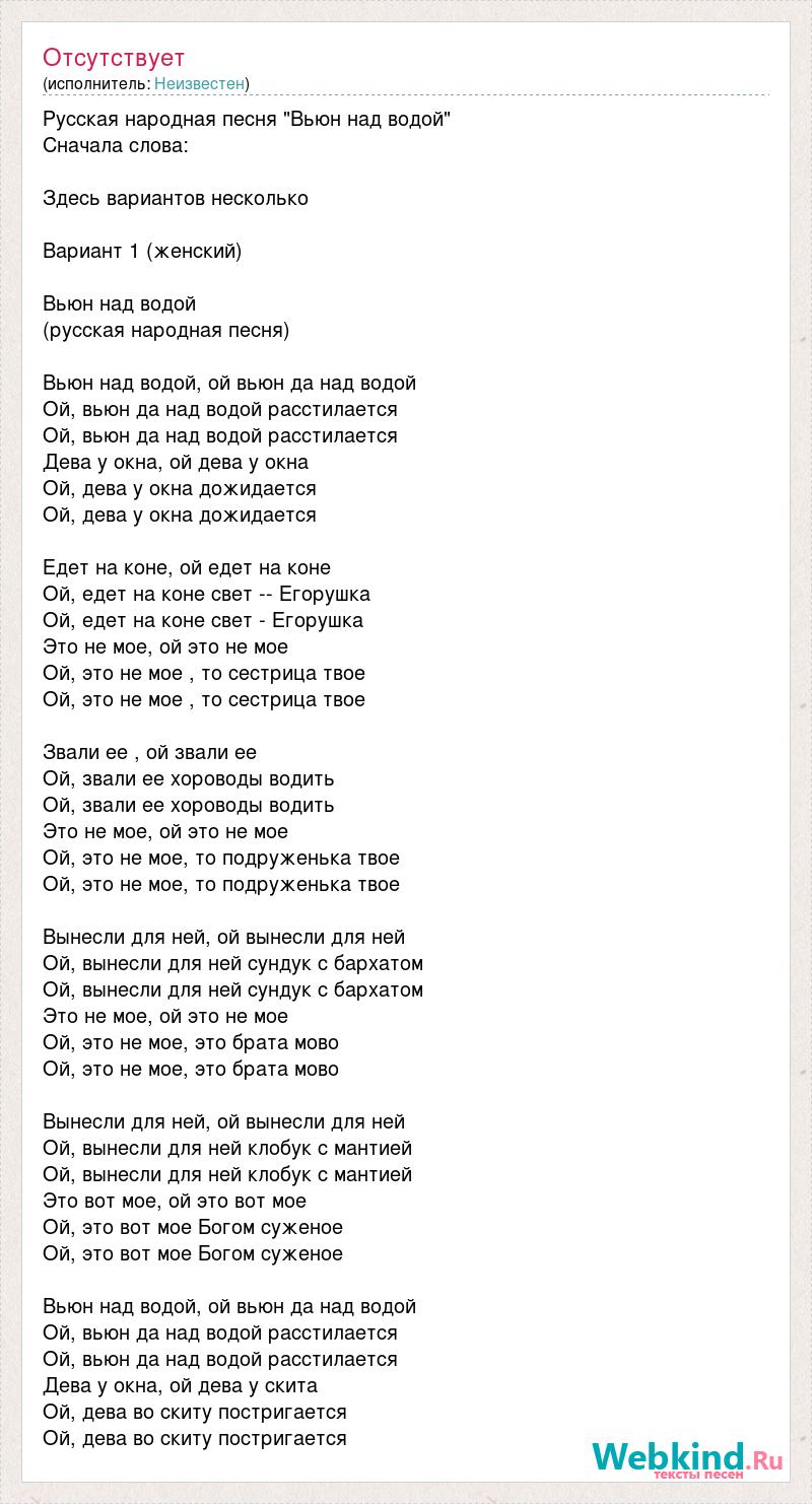 Русская народная песня "Вьюн над водой" Сначала слова: Здесь вариантов несколько Вариант 1 (женский) Вьюн над водой (русская народная песня) Вьюн над водой, ой вьюн да над водой Ой, вьюн да над водой расстилается Ой, вьюн да над водой расстилается Дева у окна, ой дева у окна Ой, дева у окна дожидается Ой, дева у окна дожидается Едет на коне, ой едет на коне Ой, едет на коне свет -- Егорушка Ой, едет на коне свет - Егорушка Это не мое, ой это не мое Ой, это не мое , то сестрица твое Ой, это не мое , то сестрица твое Звали ее , ой звали ее Ой, звали ее хороводы водить Ой, звали ее хороводы водить Это не мое, ой это не мое Ой, это не мое, то подруженька твое Ой, это не мое, то подруженька твое Вынесли для ней, ой вынесли для ней Ой, вынесли для ней сундук с бархатом Ой, вынесли для ней сундук с бархатом Это не мое, ой это не мое Ой, это не мое, это брата мово Ой, это не мое, это брата мово Вынесли для ней, ой вынесли для ней Ой, вынесли для ней клобук с мантией Ой, вынесли для ней клобук с мантией Это вот мое, ой это вот мое Ой, это вот мое Богом суженое Ой, это вот мое Богом суженое Вьюн над водой, ой вьюн да над водой Ой, вьюн да над водой расстилается Ой, вьюн да над водой расстилается Дева у окна, ой дева у скита Ой, дева во скиту постригается Ой, дева во скиту постригается