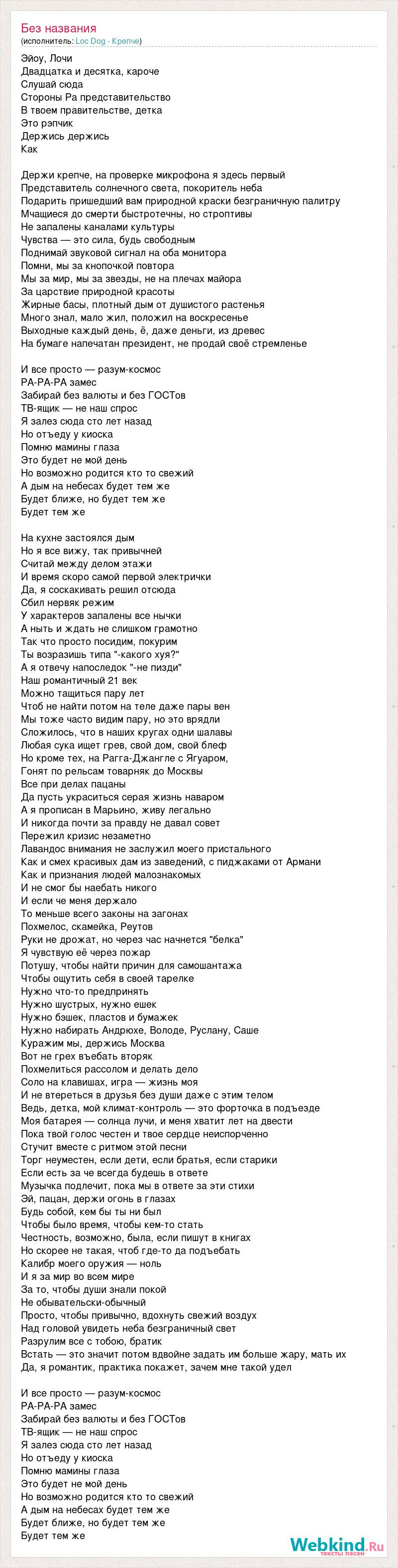 Эйоу, Лочи Двадцатка и десятка, кароче Слушай сюда Стороны Ра представительство В твоем правительстве, детка Это рэпчик Держись держись Как Держи крепче, на проверке микрофона я здесь первый Представитель солнечного света, покоритель неба Подарить пришедший вам природной краски безграничную палитру Мчащиеся до смерти быстротечны, но строптивы Не запалены каналами культуры Чувства — это сила, будь свободным Поднимай звуковой сигнал на оба монитора Помни, мы за кнопочкой повтора Мы за мир, мы за звезды, не на плечах майора За царствие природной красоты Жирные басы, плотный дым от душистого растенья Много знал, мало жил, положил на воскресенье Выходные каждый день, ё, даже деньги, из древес На бумаге напечатан президент, не продай своё стремленье И все просто — разум-космос РА-РА-РА замес Забирай без валюты и без ГОСТов ТВ-ящик — не наш спрос Я залез сюда сто лет назад Но отъеду у киоска Помню мамины глаза Это будет не мой день Но возможно родится кто то свежий А дым на небесах будет тем же Будет ближе, но будет тем же Будет тем же На кухне застоялся дым Но я все вижу, так привычней Считай между делом этажи И время скоро самой первой электрички Да, я соскакивать решил отсюда Сбил нервяк режим У характеров запалены все нычки А ныть и ждать не слишком грамотно Так что просто посидим, покурим Ты возразишь типа "-какого хуя?" А я отвечу напоследок "-не пизди" Наш романтичный 21 век Можно тащиться пару лет Чтоб не найти потом на теле даже пары вен Мы тоже часто видим пару, но это врядли Сложилось, что в наших кругах одни шалавы Любая сука ищет грев, свой дом, свой блеф Но кроме тех, на Рагга-Джангле с Ягуаром, Гонят по рельсам товарняк до Москвы Все при делах пацаны Да пусть украситься серая жизнь наваром А я прописан в Марьино, живу легально И никогда почти за правду не давал совет Пережил кризис незаметно Лавандос внимания не заслужил моего пристального Как и смех красивых дам из заведений, с пиджаками от Армани Как и признания людей малознакомых И не смог бы наебать никого И если че меня держало То меньше всего законы на загонах Похмелос, скамейка, Реутов Руки не дрожат, но через час начнется "белка" Я чувствую её через пожар Потушу, чтобы найти причин для самошантажа Чтобы ощутить себя в своей тарелке Нужно что-то предпринять Нужно шустрых, нужно ешек Нужно бэшек, пластов и бумажек Нужно набирать Андрюхе, Володе, Руслану, Саше Куражим мы, держись Москва Вот не грех въебать вторяк Похмелиться рассолом и делать дело Соло на клавишах, игра — жизнь моя И не втереться в друзья без души даже с этим телом Ведь, детка, мой климат-контроль — это форточка в подъезде Моя батарея — солнца лучи, и меня хватит лет на двести Пока твой голос честен и твое сердце неиспорченно Стучит вместе с ритмом этой песни Торг неуместен, если дети, если братья, если старики Если есть за че всегда будешь в ответе Музычка подлечит, пока мы в ответе за эти стихи Эй, пацан, держи огонь в глазах Будь собой, кем бы ты ни был Чтобы было время, чтобы кем-то стать Честность, возможно, была, если пишут в книгах Но скорее не такая, чтоб где-то да подъебать Калибр моего оружия — ноль И я за мир во всем мире За то, чтобы души знали покой Не обывательски-обычный Просто, чтобы привычно, вдохнуть свежий воздух Над головой увидеть неба безграничный свет Разрулим все с тобою, братик Встать — это значит по