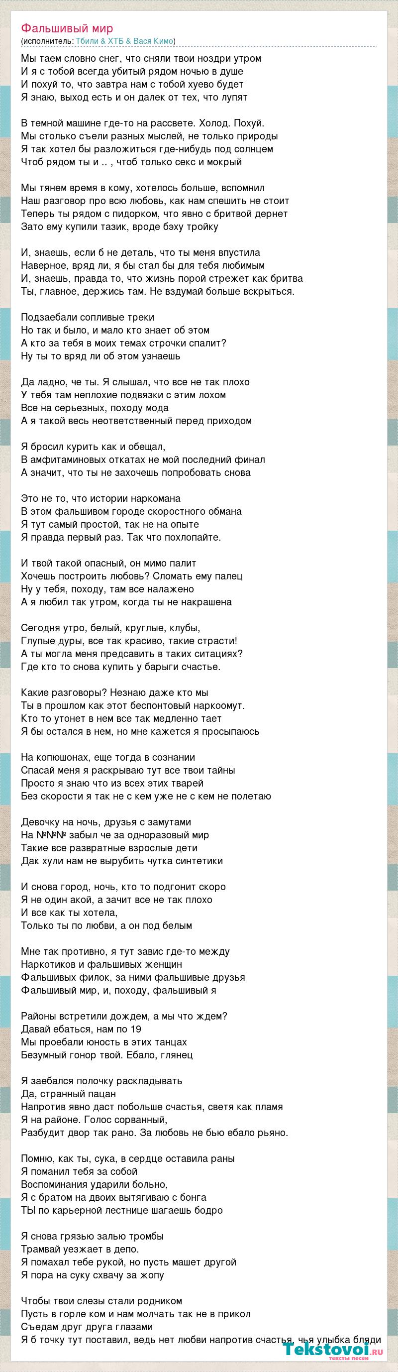 Мы таем словно снег, что сняли твои ноздри утром И я с тобой всегда убитый рядом ночью в душе И похуй то, что завтра нам с тобой хуево будет Я знаю, выход есть и он далек от тех, что лупят В темной машине где-то на рассвете. Холод. Похуй. Мы столько съели разных мыслей, не только природы Я так хотел бы разложиться где-нибудь под солнцем Чтоб рядом ты и .. , чтоб только секс и мокрый Мы тянем время в кому, хотелось больше, вспомнил Наш разговор про всю любовь, как нам спешить не стоит Теперь ты рядом с пидорком, что явно с бритвой дернет Зато ему купили тазик, вроде бэху тройку И, знаешь, если б не деталь, что ты меня впустила Наверное, вряд ли, я бы стал бы для тебя любимым И, знаешь, правда то, что жизнь порой стрежет как бритва Ты, главное, держись там. Не вздумай больше вскрыться. Подзаебали сопливые треки Но так и было, и мало кто знает об этом А кто за тебя в моих темах строчки спалит? Ну ты то вряд ли об этом узнаешь Да ладно, че ты. Я слышал, что все не так плохо У тебя там неплохие подвязки с этим лохом Все на серьезных, походу мода А я такой весь неответственный перед приходом Я бросил курить как и обещал, В амфитаминовых откатах не мой последний финал А значит, что ты не захочешь попробовать снова Это не то, что истории наркомана В этом фальшивом городе скоростного обмана Я тут самый простой, так не на опыте Я правда первый раз. Так что похлопайте. И твой такой опасный, он мимо палит Хочешь построить любовь? Сломать ему палец Ну у тебя, походу, там все налажено А я любил так утром, когда ты не накрашена Сегодня утро, белый, круглые, клубы, Глупые дуры, все так красиво, такие страсти! А ты могла меня предсавить в таких ситациях? Где кто то снова купить у барыги счастье. Какие разговоры? Незнаю даже кто мы Ты в прошлом как этот беспонтовый наркоомут. Кто то утонет в нем все так медленно тает Я бы остался в нем, но мне кажется я просыпаюсь На копюшонах, еще тогда в сознании Спасай меня я раскрываю тут все твои тайны Просто я знаю что из всех этих тварей Без скорости я так не с кем уже не с кем не полетаю Девочку на ночь, друзья с замутами На №№№ забыл че за одноразовый мир Такие все развратные взрослые дети Дак хули нам не вырубить чутка синтетики И снова город, ночь, кто то подгонит скоро Я не один акой, а зачит все не так плохо И все как ты хотела, Только ты по любви, а он под белым Мне так противно, я тут завис где-то между Наркотиков и фальшивых женщин Фальшивых филок, за ними фальшивые друзья Фальшивый мир, и, походу, фальшивый я Районы встретили дождем, а мы что ждем? Давай ебаться, нам по 19 Мы проебали юность в этих танцах Безумный гонор твой. Ебало, глянец Я заебался полочку раскладывать Да, странный пацан Напротив явно даст побольше счастья, светя как пламя Я на районе. Голос сорванный, Разбудит двор так рано. За любовь не бью ебало рьяно. Помню, как ты, сука, в сердце оставила раны Я поманил тебя за собой Воспоминания ударили больно, Я с братом на двоих вытягиваю с бонга ТЫ по карьерной лестнице шагаешь бодро Я снова грязью залью тромбы Трамвай уезжает в депо. Я помахал тебе рукой, но пусть машет другой Я пора на суку схвачу за жопу Чтобы твои слезы стали родником Пусть в горле ком и нам молчать так не в прикол Съедам друг друга глазами Я б точку тут поставил, ведь нет любви напротив счастья, чья улыбка бляди