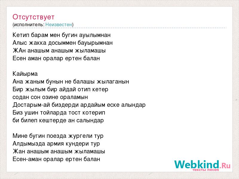 Кетип барам мен бугин ауылымнан Алыс жакка досыммен бауырымнан ЖАн анашым анашым жыламашы Есен аман оралар ертен балан Кайырма Ана жаным бунын не балашы жылаганын Бир жылым бир айдай отип кетер содан сон озине ораламын Достарым-ай биздерди ардайым еске алындар Биз ушин тойларда тост котерип би билеп кештерде ан салындар Мине бугин поезда жургели тур Алдымызда армия кундери тур Жан анашым анашым жыламашы Есен-аман оралар ертен балан
