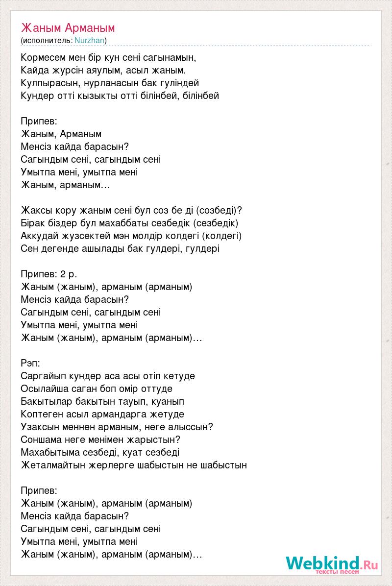 Кормесем мен бiр кун сенi сагынамын, Кайда журсiн аяулым, асыл жаным. Кулпырасын, нурланасын бак гулiндей Кундер оттi кызыкты оттi бiлiнбей, бiлiнбей Припев: Жаным, Арманым Менсiз кайда барасын? Сагындым сенi, сагындым сенi Умытпа менi, умытпа менi Жаным, арманым… Жаксы кору жаным сенi бул соз бе дi (созбедi)? Бiрак бiздер бул махаббаты сезбедiк (сезбедiк) Аккудай жузсектей мэн молдiр колдегi (колдегi) Cен дегенде ашылады бак гулдерi, гулдерi Припев: 2 р. Жаным (жаным), арманым (арманым) Менсiз кайда барасын? Сагындым сенi, сагындым сенi Умытпа менi, умытпа менi Жаным (жаным), арманым (арманым)… Рэп: Саргайып кундер аса асы отiп кетуде Осылайша саган боп омiр оттуде Бакытылар бакытын тауып, куанып Коптеген асыл армандарга жетуде Узаксын меннен арманым, неге алыссын? Соншама неге менiмен жарыстын? Махабытыма сезбедi, куат сезбедi Жеталмайтын жерлерге шабыстын не шабыстын Припев: Жаным (жаным), арманым (арманым) Менсiз кайда барасын? Сагындым сенi, сагындым сенi Умытпа менi, умытпа менi Жаным (жаным), арманым (арманым)…