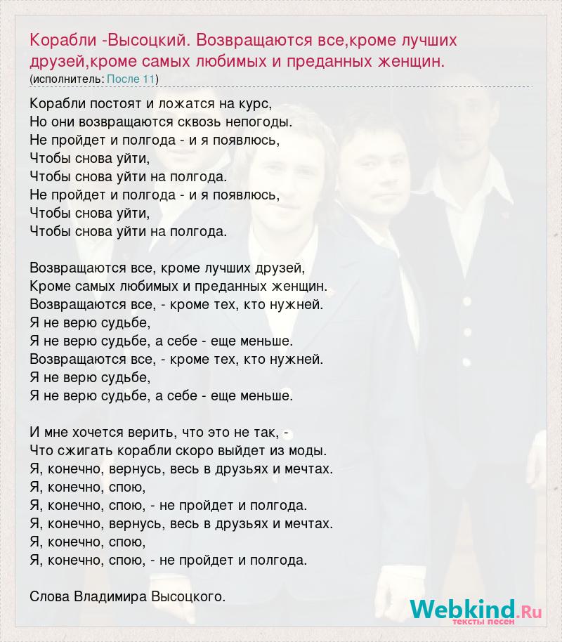 Главная→Исполнители→После 11→Корабли -Высоцкий. Возвращаются все,кроме лучших друзей,кроме самых любимых